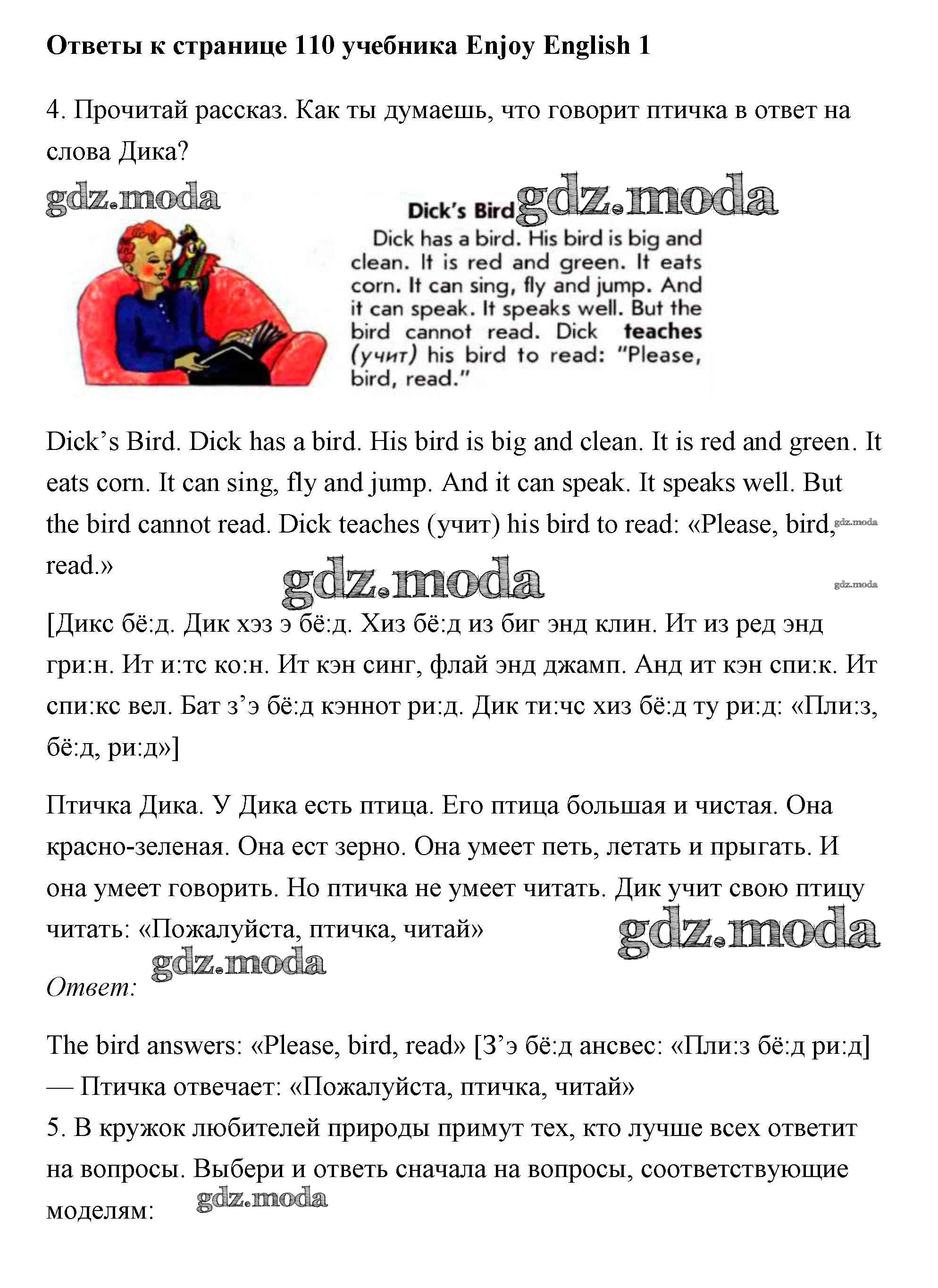 ОТВЕТ на задание № 110 Учебник по Английскому языку 1 класс Биболетова Enjoy English