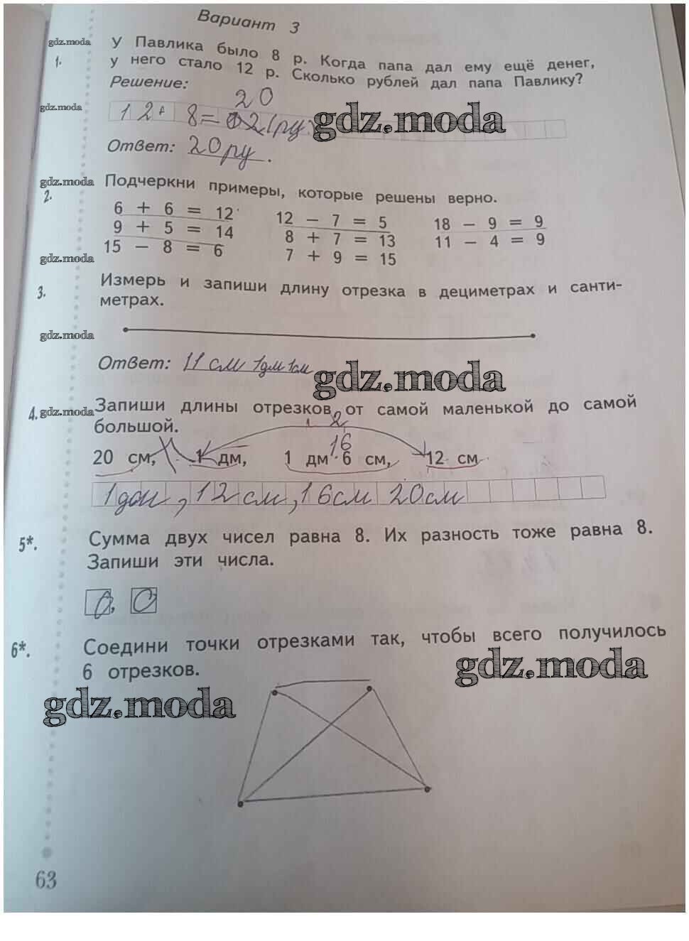ГДЗ решение к заданию № 63 Математика 1 класс тетрадь для проверочных работ Рудницкая В.Н. Вентана-граф 2020 ФГОС бесплатно на гдз.мода!