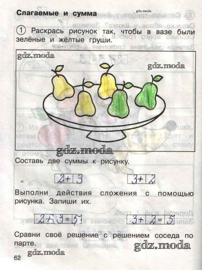 ГДЗ решение к заданию № 62 Математика 1 класс тетрадь для самостоятельной работы Захарова О.А. Академкнига 2016 Часть 1, Часть 2 бесплатно на гдз.мода!
