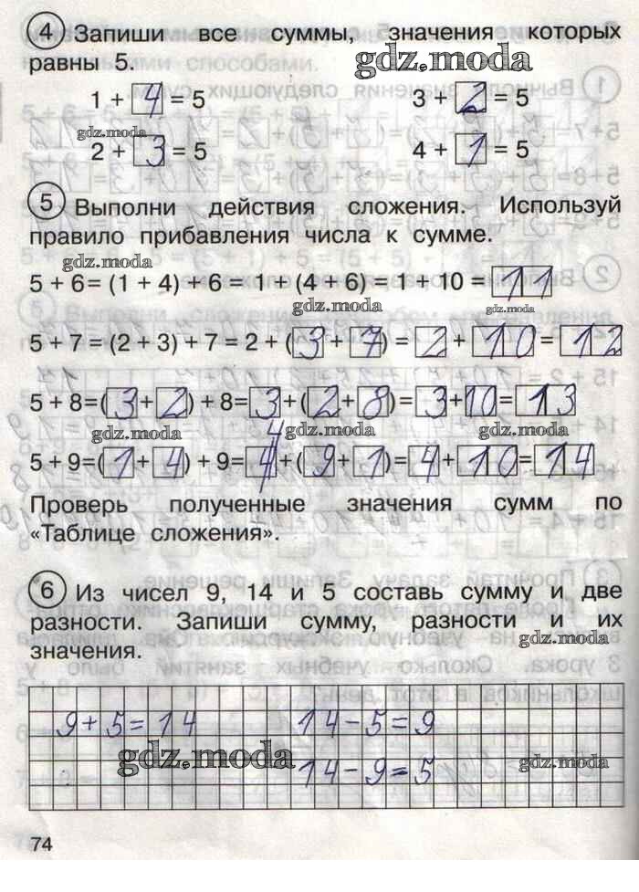 ГДЗ решение к заданию № 74 Математика 1 класс тетрадь для самостоятельной работы Захарова О.А. Академкнига 2016 Часть 1, Часть 2 бесплатно на гдз.мода!