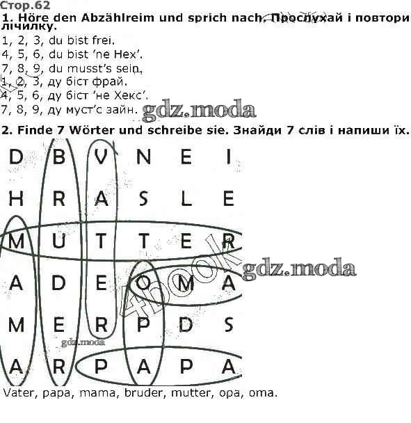 ГДЗ решение к заданию № 62 Немецкий язык 1 класс Сотникова Ранок 2018 бесплатно на гдз.мода!