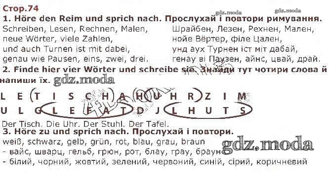 ГДЗ решение к заданию № 74 Немецкий язык 1 класс Сотникова Ранок 2018 бесплатно на гдз.мода!