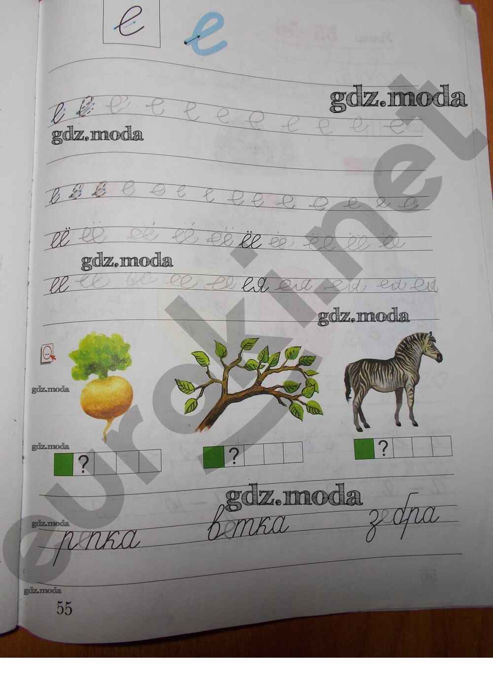 ГДЗ решение к заданию № 55 Русский язык 1 класс рабочая тетрадь Прописи Безруких М.М. Вентана-граф 2019 ФГОС бесплатно на гдз.мода!