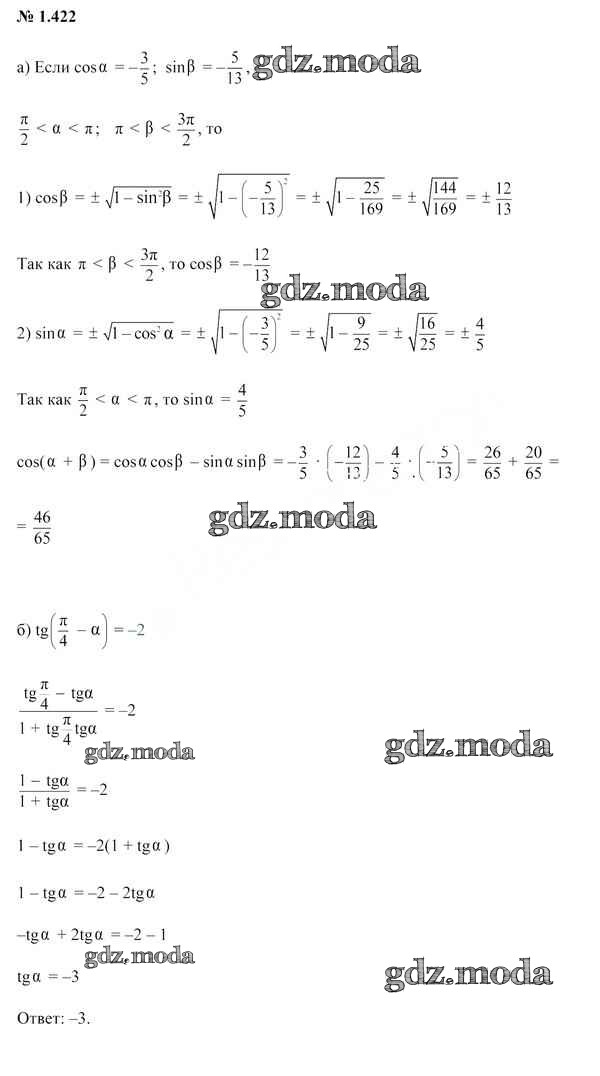 ОТВЕТ на задание № 1.422 Учебник по Алгебре 10 класс Арефьева