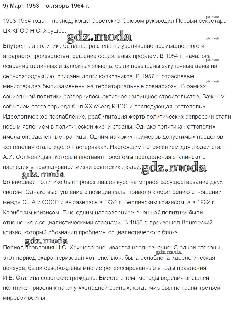 ГДЗ решение к заданию № 9 История России 10 класс контрольные работы Артасов И.А. Просвещение 2017 ФГОС бесплатно на гдз.мода!