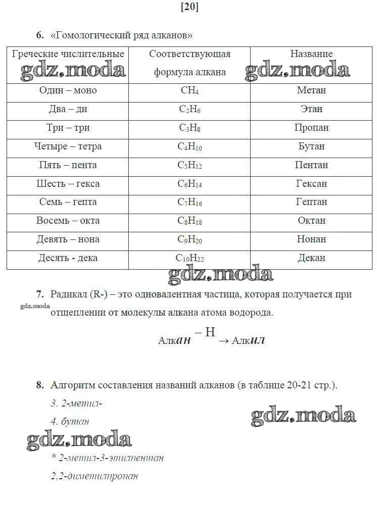 ГДЗ решение к заданию № 20 Химия 10 класс рабочая тетрадь Габриелян О.С. Дрофа 2017 Базовый уровень ФГОС бесплатно на гдз.мода!