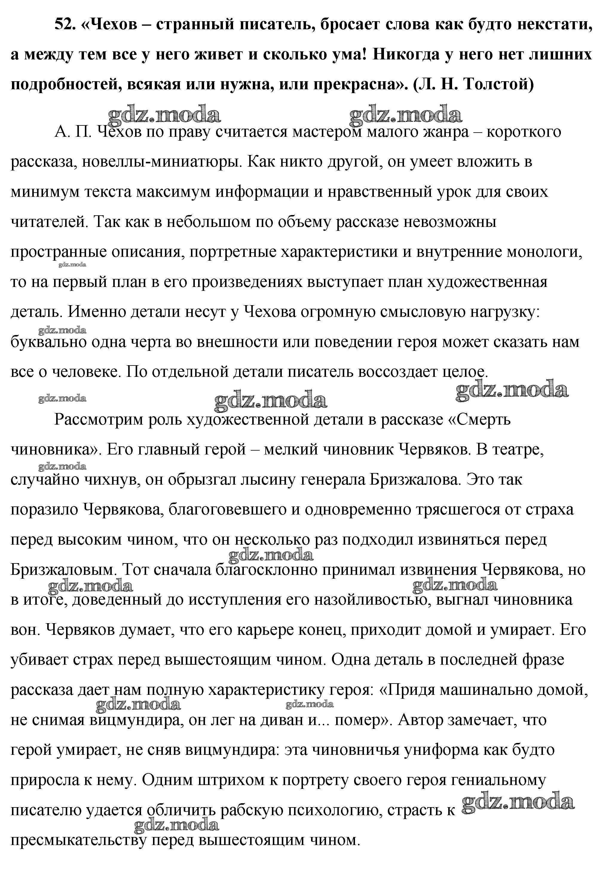 ГДЗ решение к заданию № 52. «Чехов – странный писатель, бросает слова как будто некстати, а между тем все у него живет и сколько ума! Никогда у него нет лишних подробностей, всякая или нужна, или прекрасна». (Л. Н. Толстой) Готовые сочинения по литературе 10 класс Еременко М. В. ВАКО 2020 бесплатно на гдз.мода!