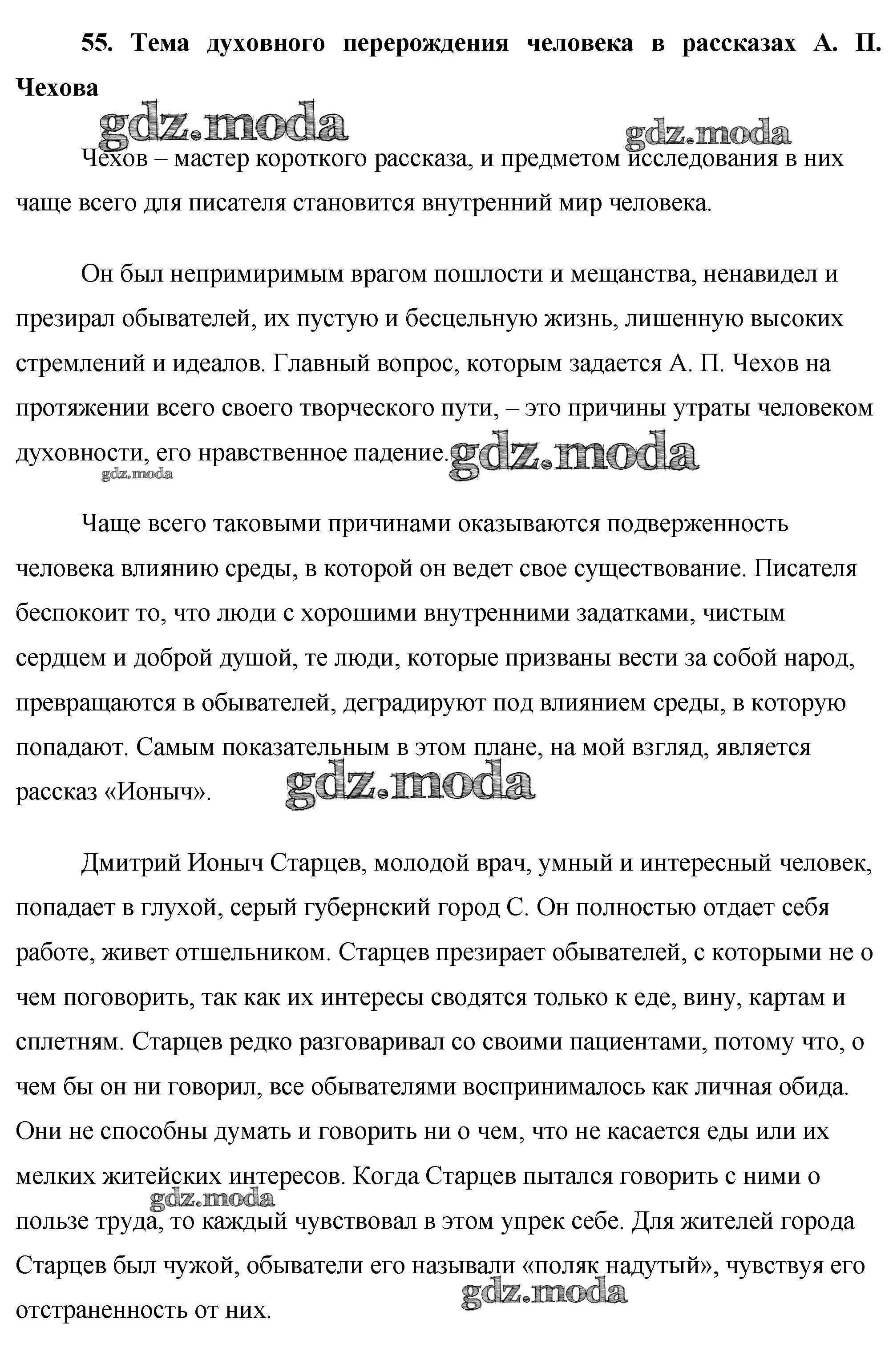 ГДЗ решение к заданию № 55. Тема духовного перерождения человека в рассказах А. П. Чехова Готовые сочинения по литературе 10 класс Еременко М. В. ВАКО 2020 бесплатно на гдз.мода!