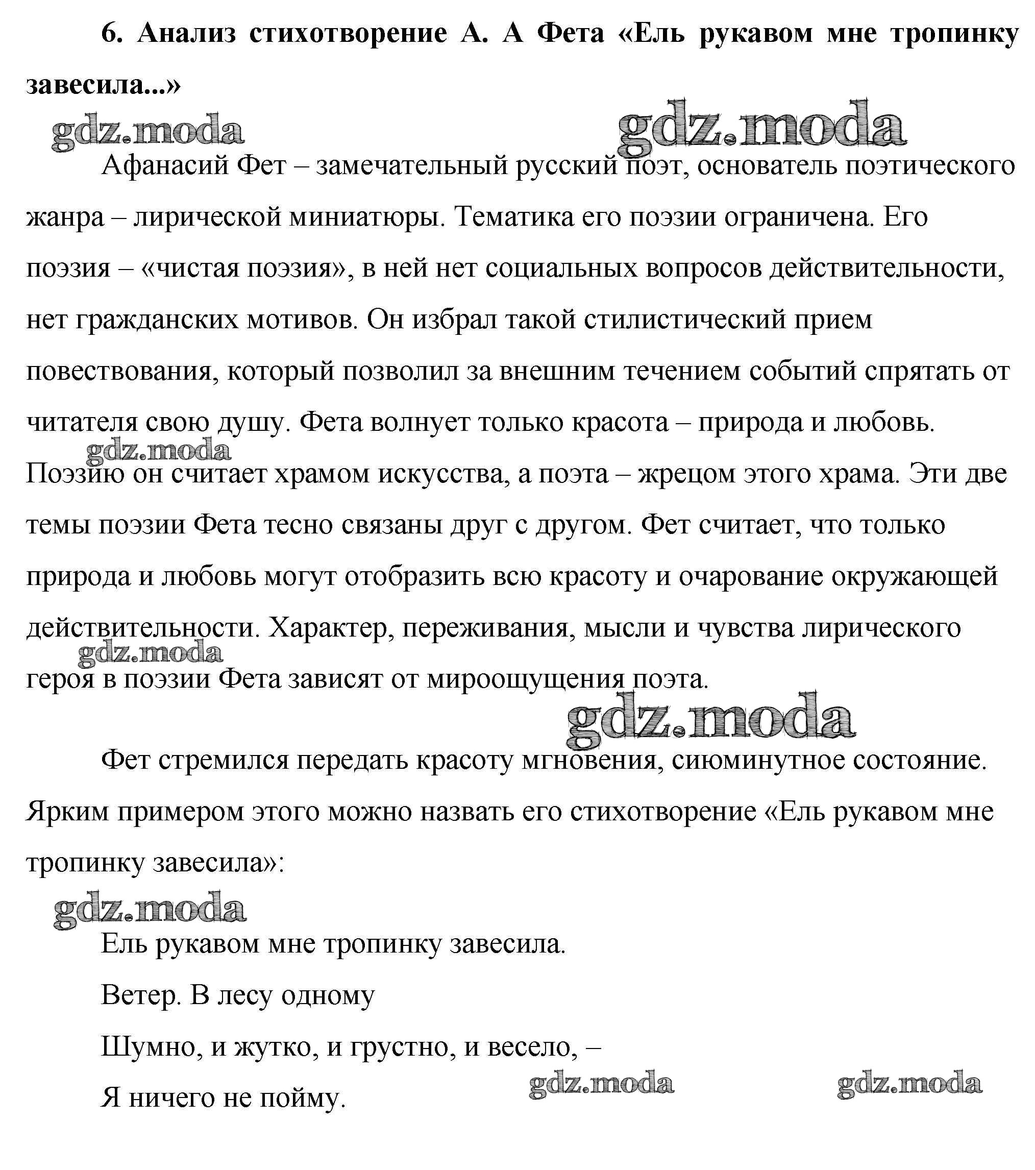 ГДЗ решение к заданию № 6. Анализ стихотворение А. А Фета «Ель рукавом мне тропинку завесила...» Готовые сочинения по литературе 10 класс Еременко М. В. ВАКО 2020 бесплатно на гдз.мода!