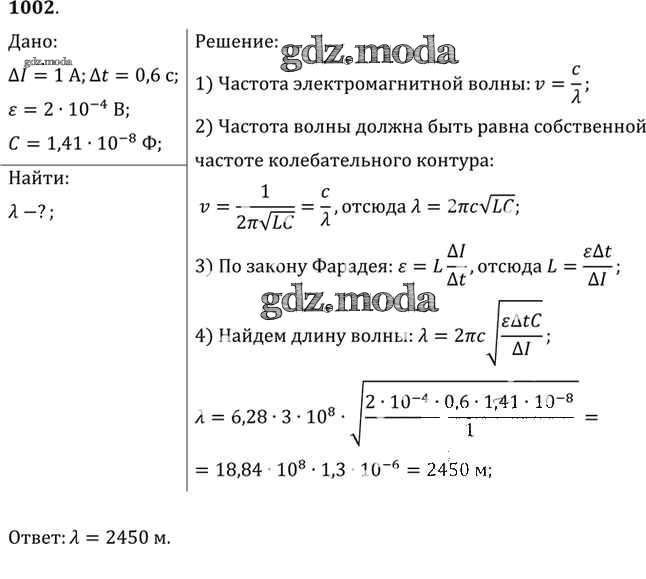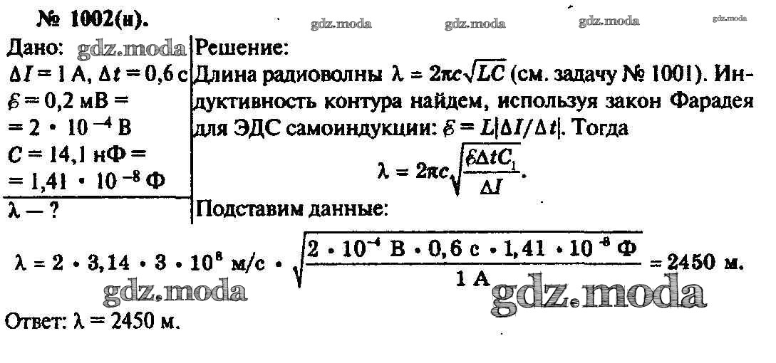 ОТВЕТ на задание № 1002 Задачник по Физике 10-11 класс Рымкевич УМК