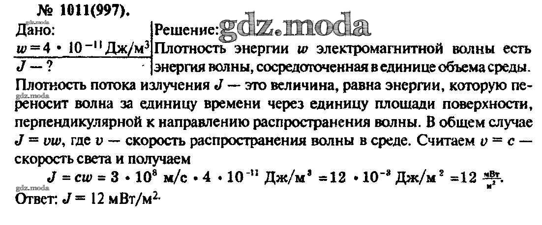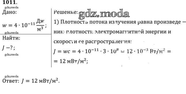 ОТВЕТ на задание № 1011 Задачник по Физике 10-11 класс Рымкевич УМК