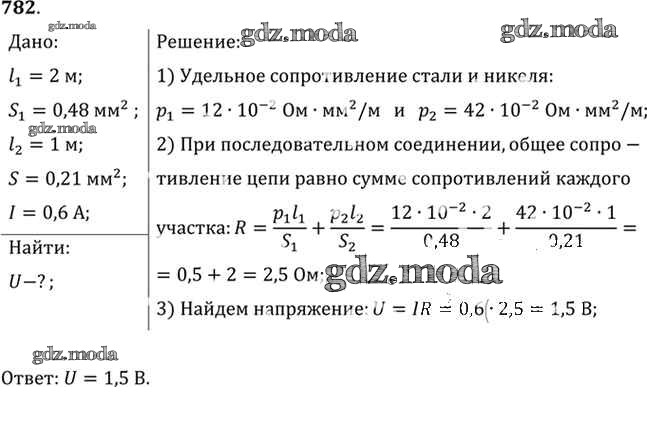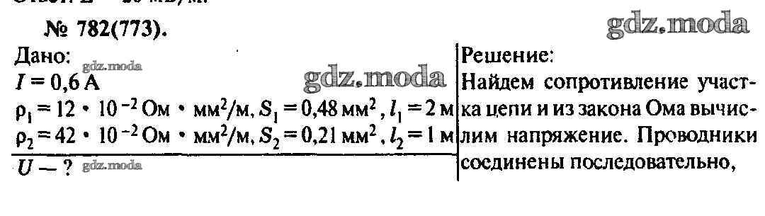ОТВЕТ на задание № 782 Задачник по Физике 10-11 класс Рымкевич УМК