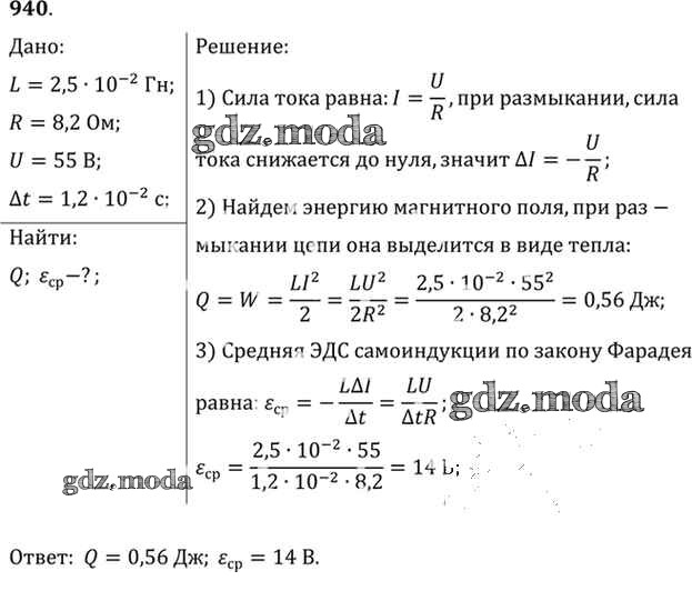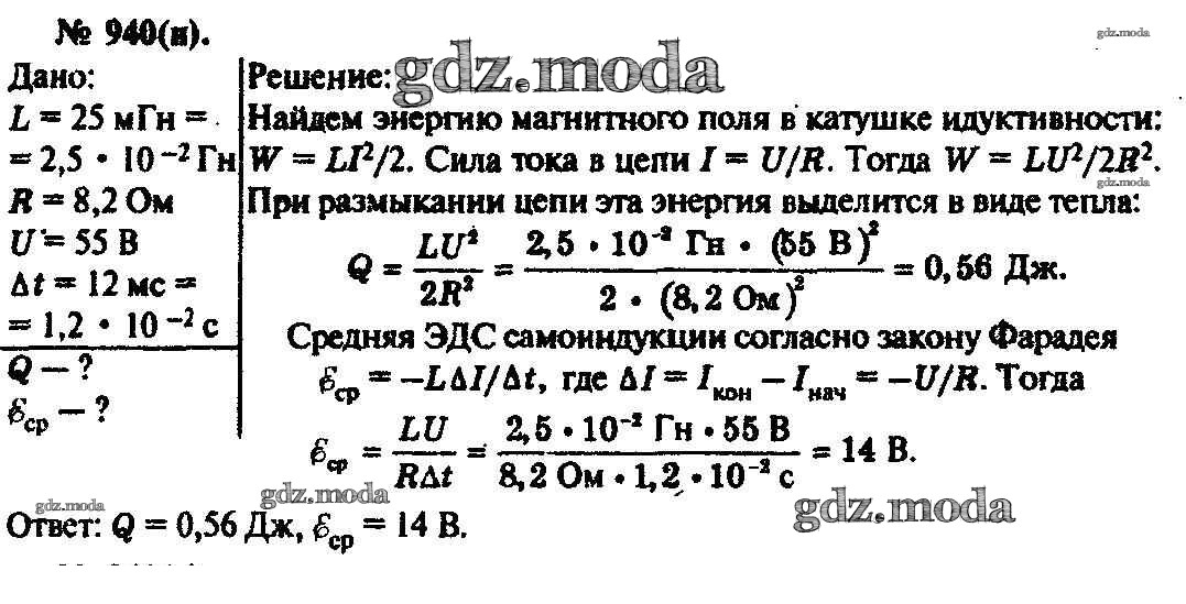 ОТВЕТ на задание № 940 Задачник по Физике 10-11 класс Рымкевич УМК