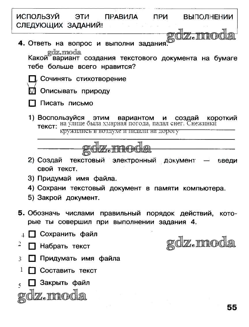 ГДЗ решение к заданию № стр. 55 Информатика 2 класс рабочая тетрадь Матвеева Н.В. Бином 2012 Часть 1, Часть 2 ФГОС бесплатно на гдз.мода!