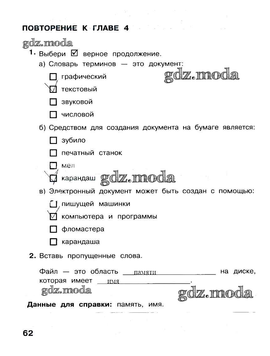 ГДЗ решение к заданию № стр. 62 Информатика 2 класс рабочая тетрадь Матвеева Н.В. Бином 2012 Часть 1, Часть 2 ФГОС бесплатно на гдз.мода!