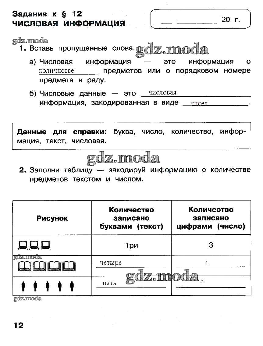 ГДЗ решение к заданию № стр. 12 Информатика 2 класс рабочая тетрадь Матвеева Н.В. Бином 2012 Часть 1, Часть 2 ФГОС бесплатно на гдз.мода!