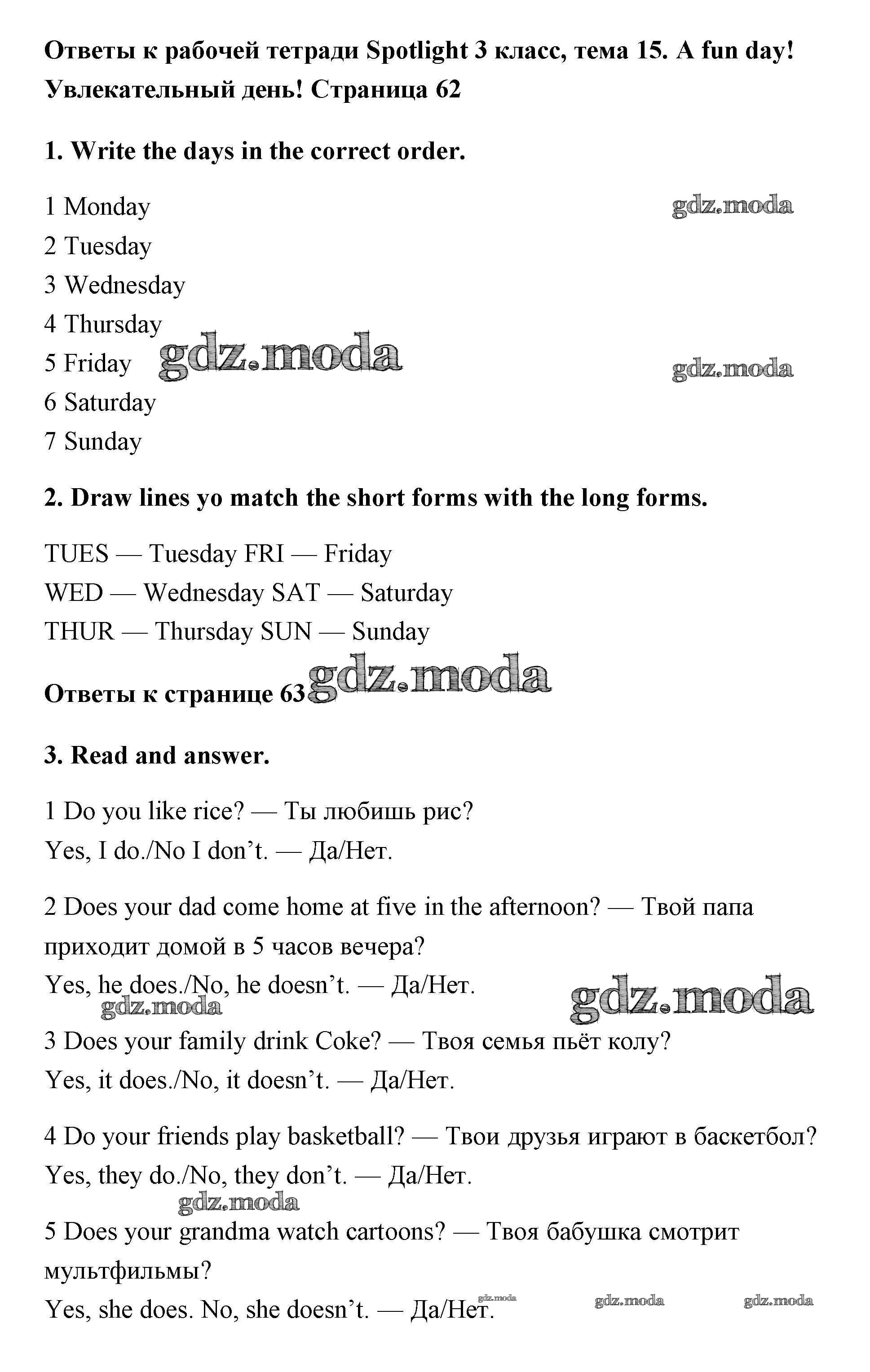 ОТВЕТ на задание № 62-63 Рабочая тетрадь по Английскому языку 3 класс Быкова Spotlight