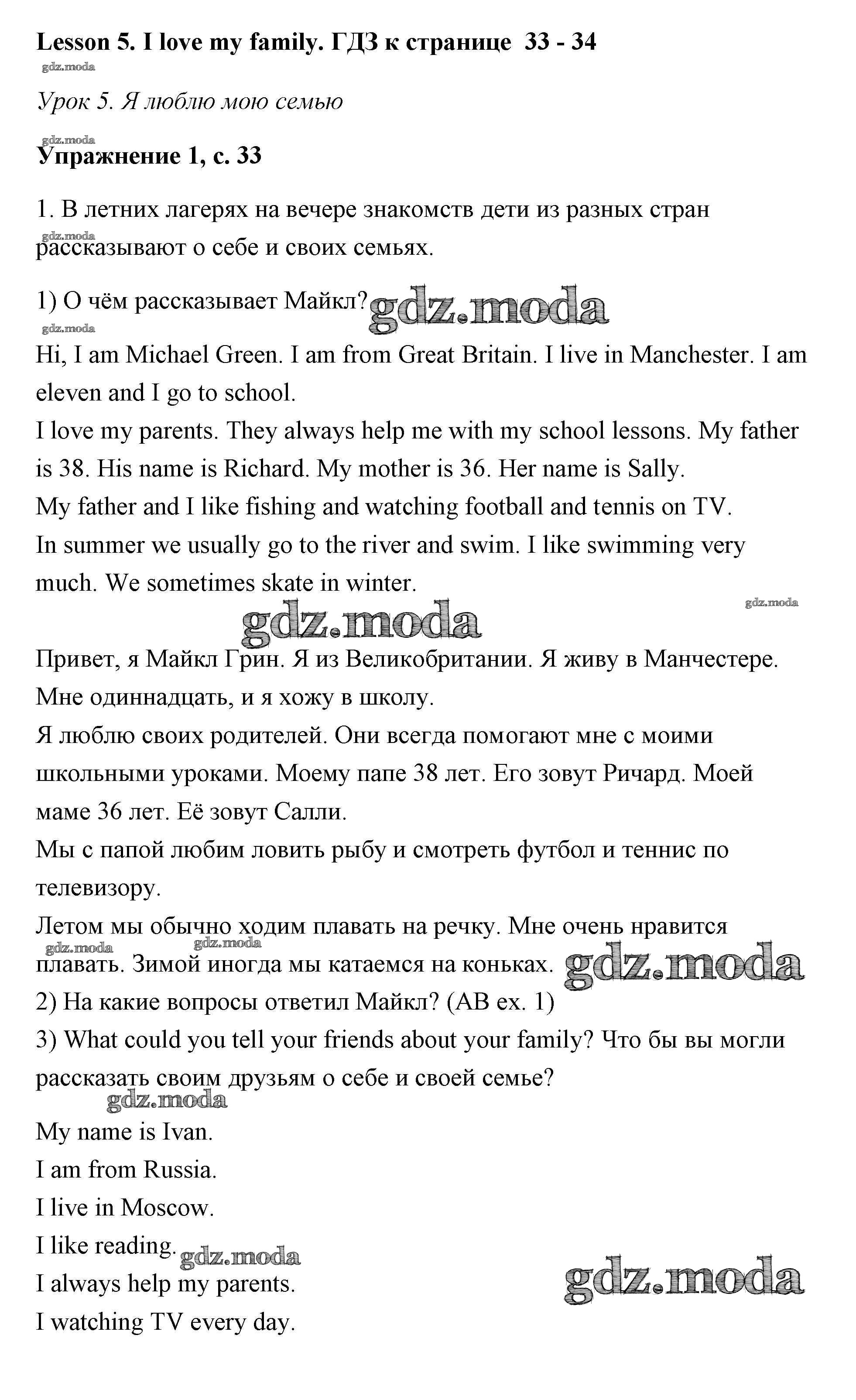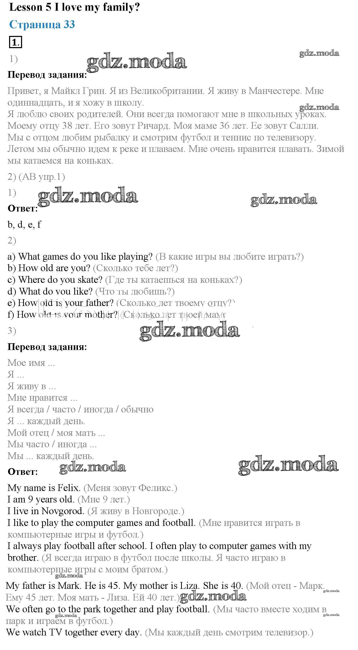 ОТВЕТ на задание № Lesson 5 (страницы 33 – 34 Учебник по Английскому языку 3 класс Кузовлев