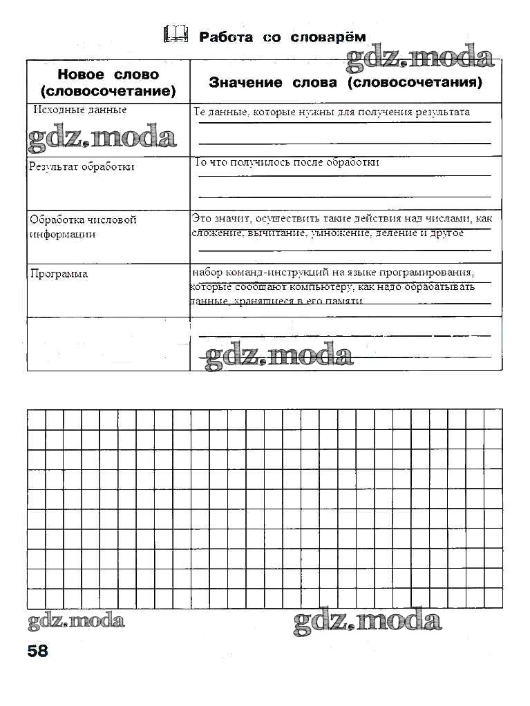 ГДЗ решение к заданию № 58 Информатика 3 класс рабочая тетрадь Матвеева Н.В. Бином 2017 Часть 1, Часть 2 ФГОС бесплатно на гдз.мода!