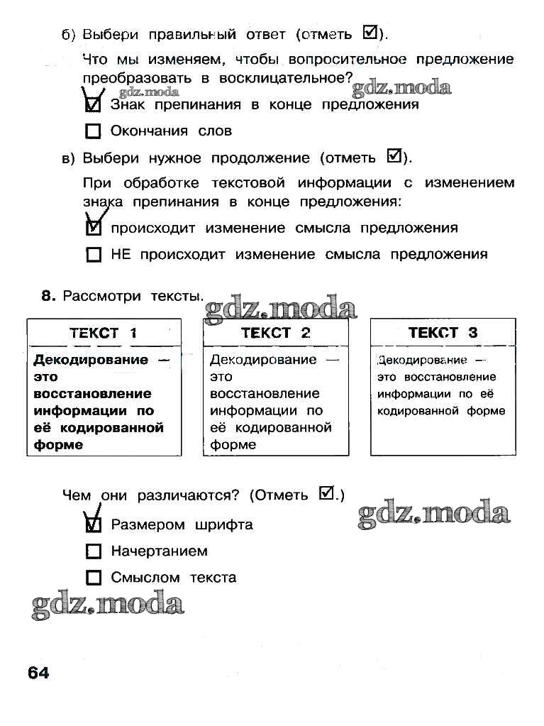 ГДЗ решение к заданию № 64 Информатика 3 класс рабочая тетрадь Матвеева Н.В. Бином 2017 Часть 1, Часть 2 ФГОС бесплатно на гдз.мода!