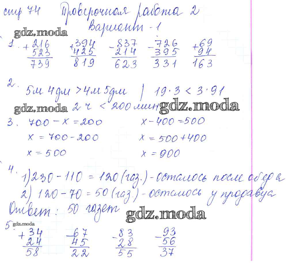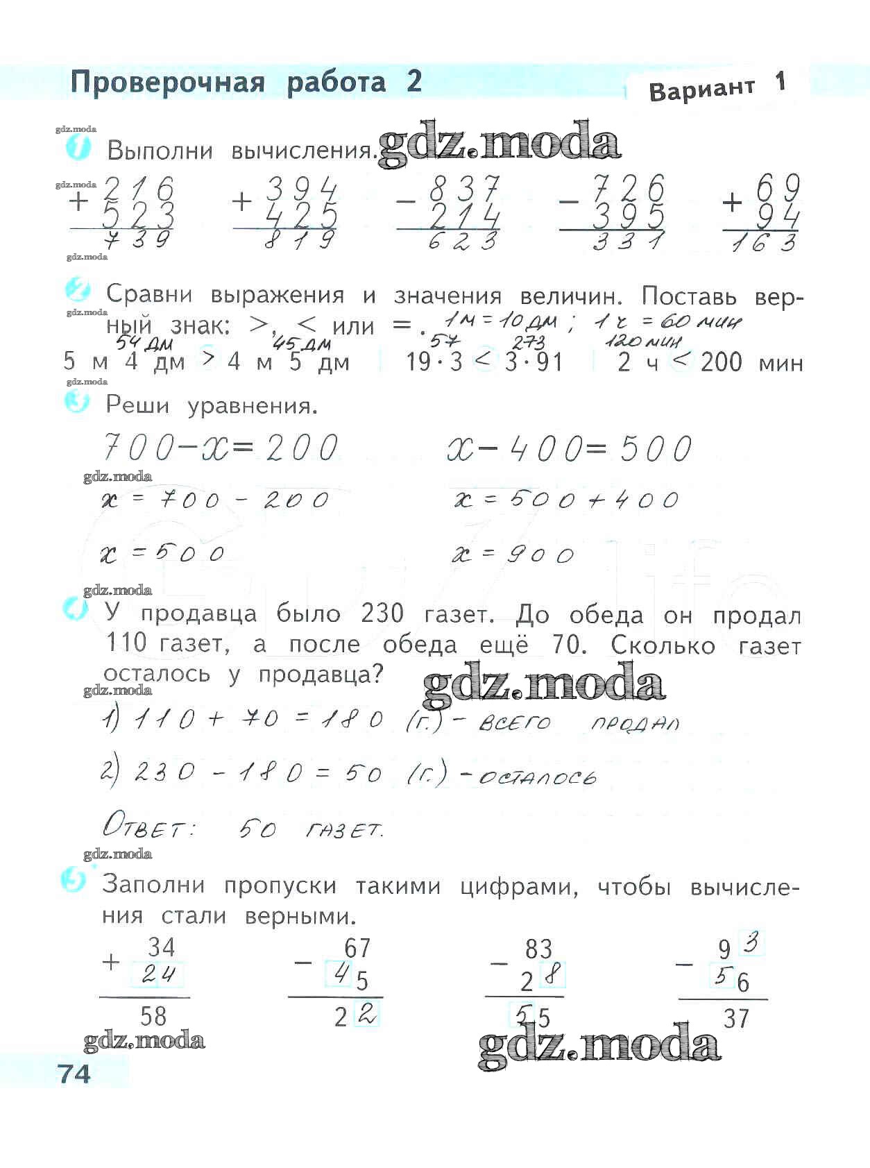 ОТВЕТ на задание № 74 Проверочные работы по Математике 3 класс Волкова Школа России