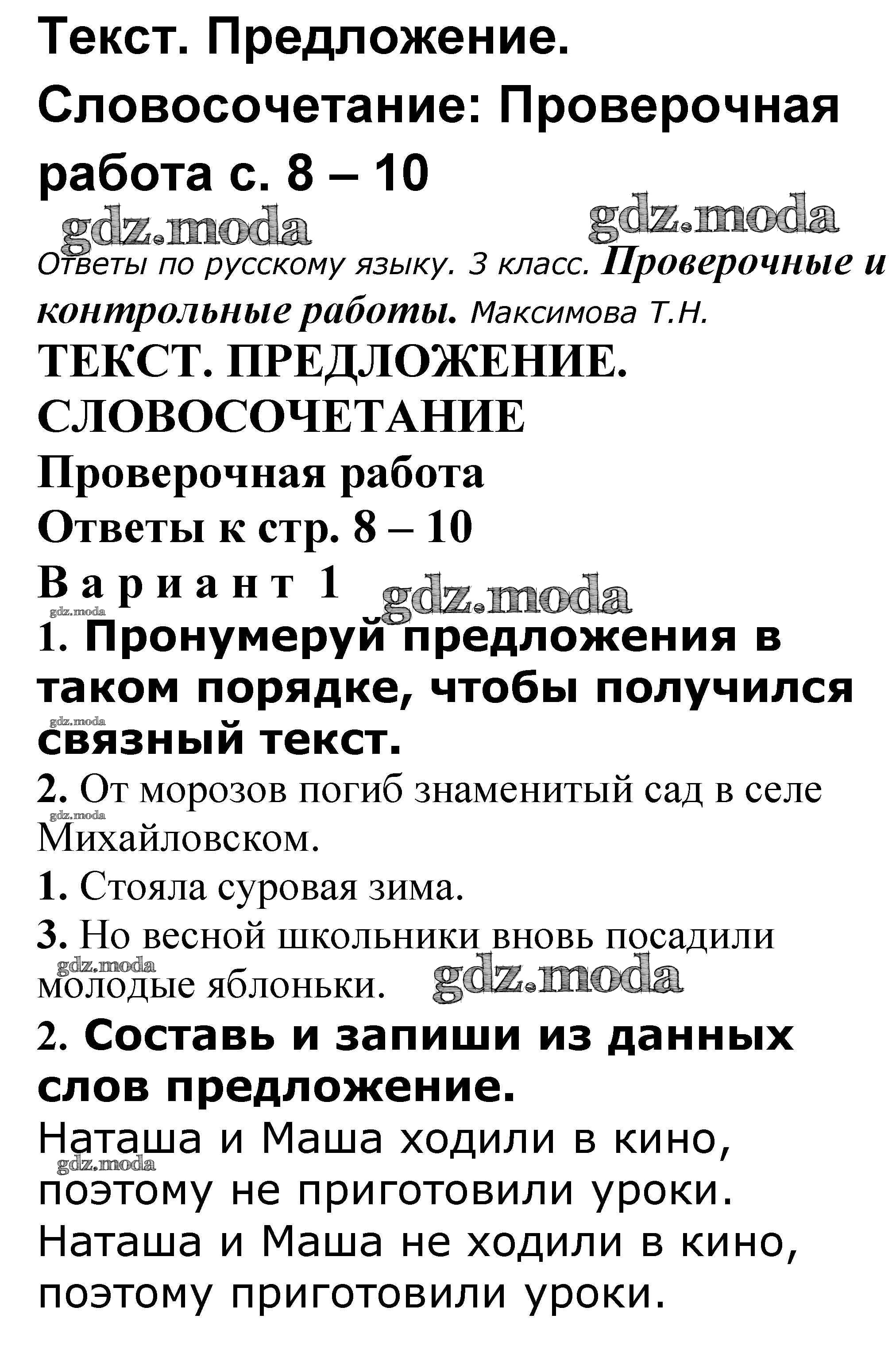 ОТВЕТ на задание № 8-10 Проверочные и контрольные работы по Русскому языку 3 класс Максимова