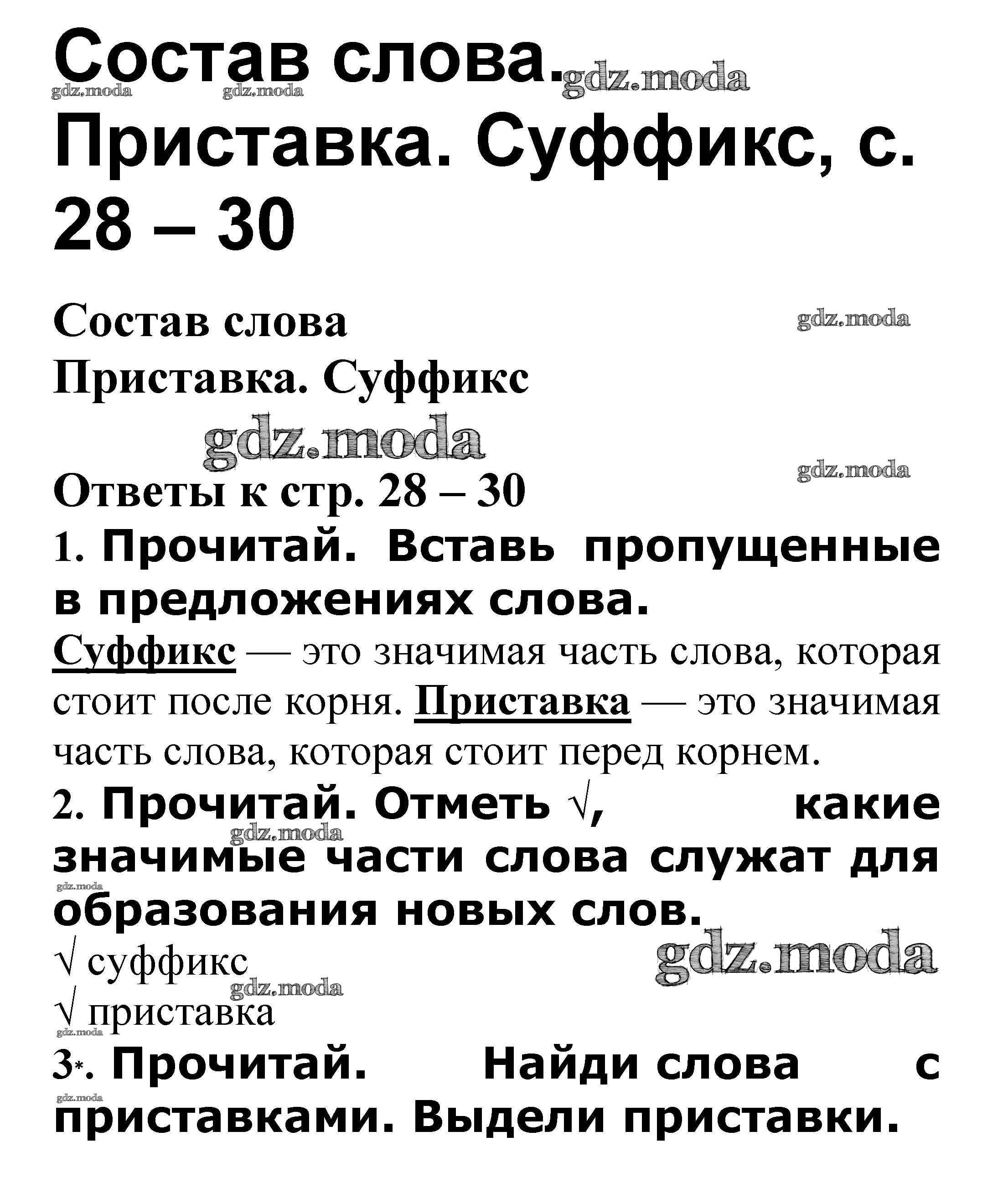 ГДЗ решение к заданию № Приставка. Суффикс стр. 28 – 30 Русский язык 3 класс проверочные работы Канакина В.П. Просвещение 2018 ФГОС бесплатно на гдз.мода!