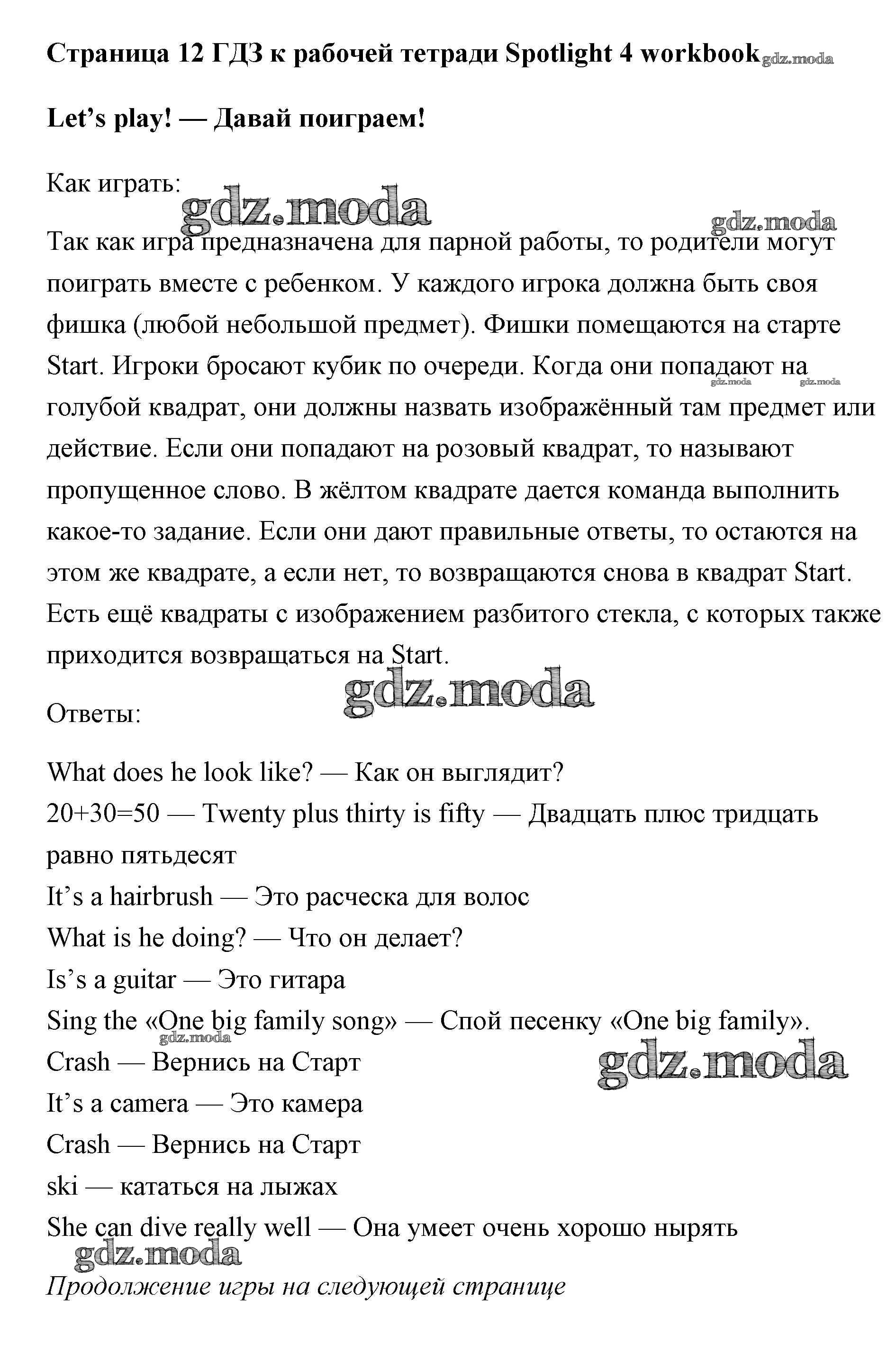 ОТВЕТ на задание № страница 12 Рабочая тетрадь по Английскому языку 4 класс Быкова Spotlight