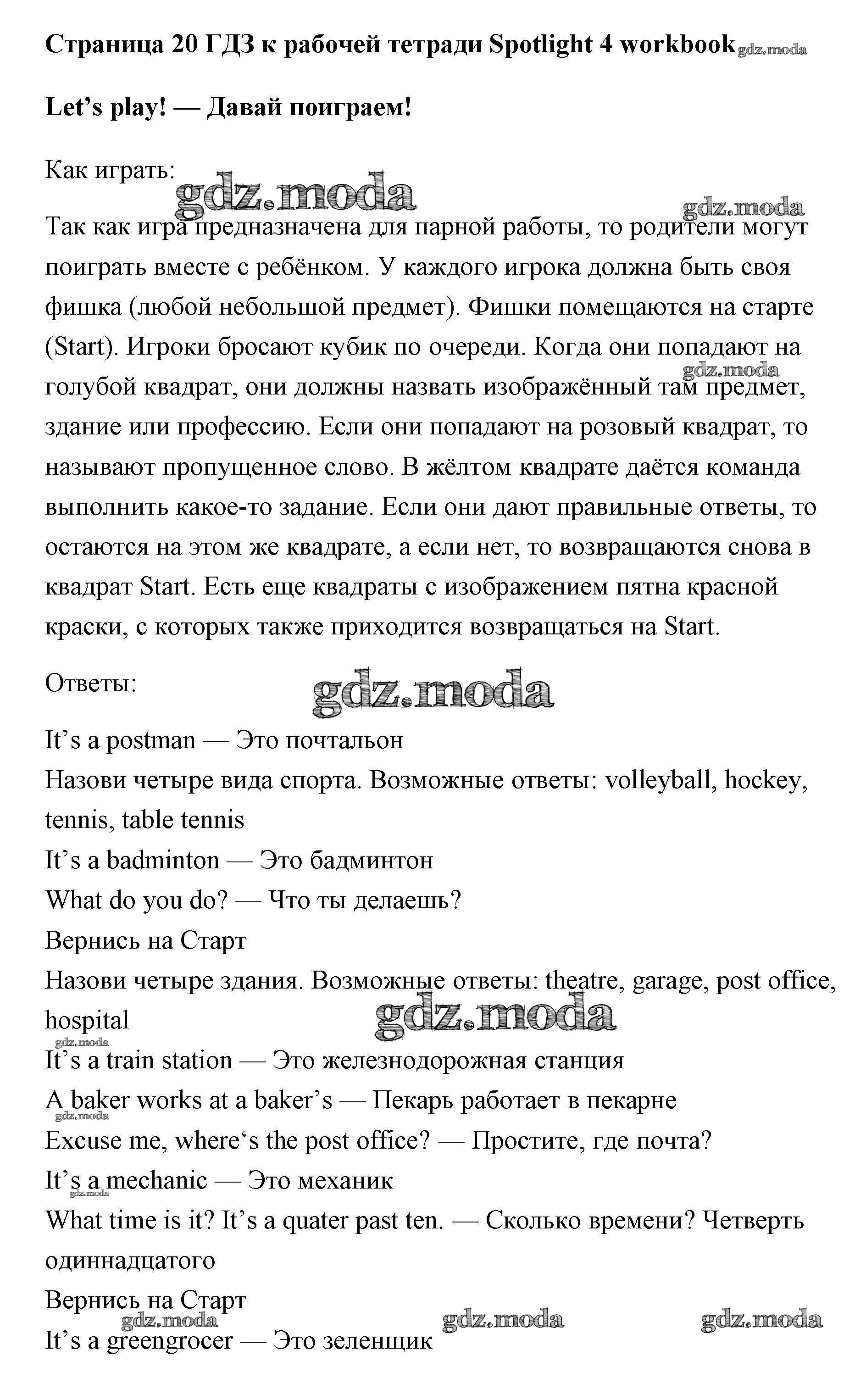 ОТВЕТ на задание № страница 20 Рабочая тетрадь по Английскому языку 4 класс Быкова Spotlight