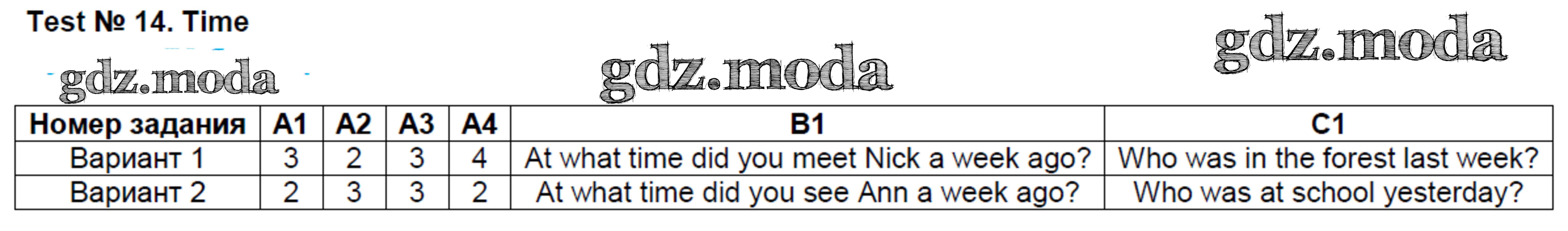 ГДЗ решение к заданию № Тест №14. Time Английский язык 4 класс контрольно-измерительные материалы Кулинич Г.Г. ВАКО 2018 ФГОС бесплатно на гдз.мода!