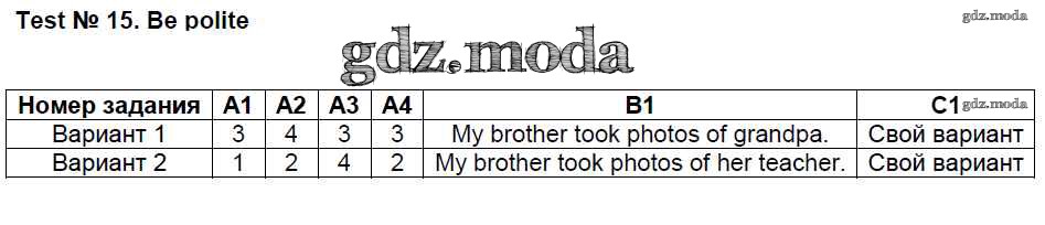 ГДЗ решение к заданию № Тест №15. Be polite Английский язык 4 класс контрольно-измерительные материалы Кулинич Г.Г. ВАКО 2018 ФГОС бесплатно на гдз.мода!