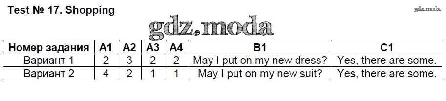 ГДЗ решение к заданию № Тест №17. Shopping Английский язык 4 класс контрольно-измерительные материалы Кулинич Г.Г. ВАКО 2018 ФГОС бесплатно на гдз.мода!