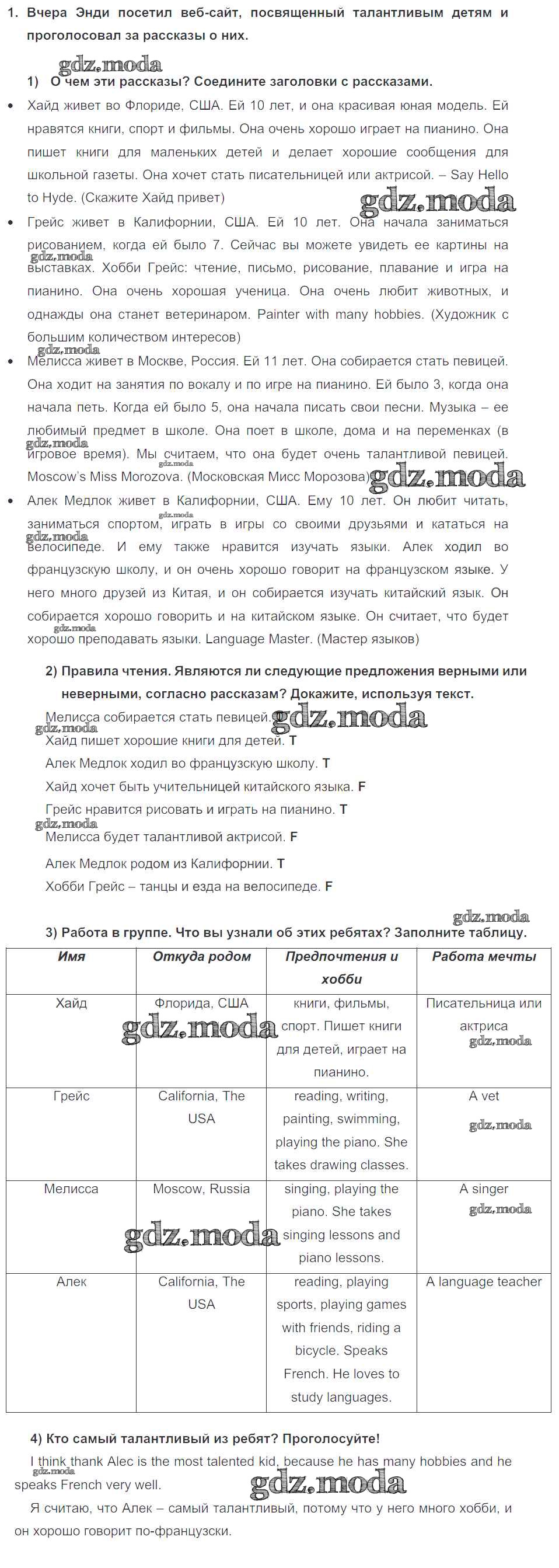 ГДЗ решение к заданию № 1 Английский язык 4 класс Кузовлёв В.П. Просвещение 2015 Часть 1, Часть 2 ФГОС бесплатно на гдз.мода!