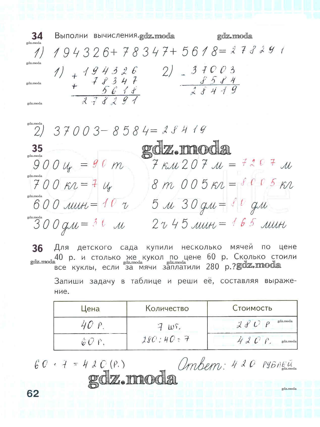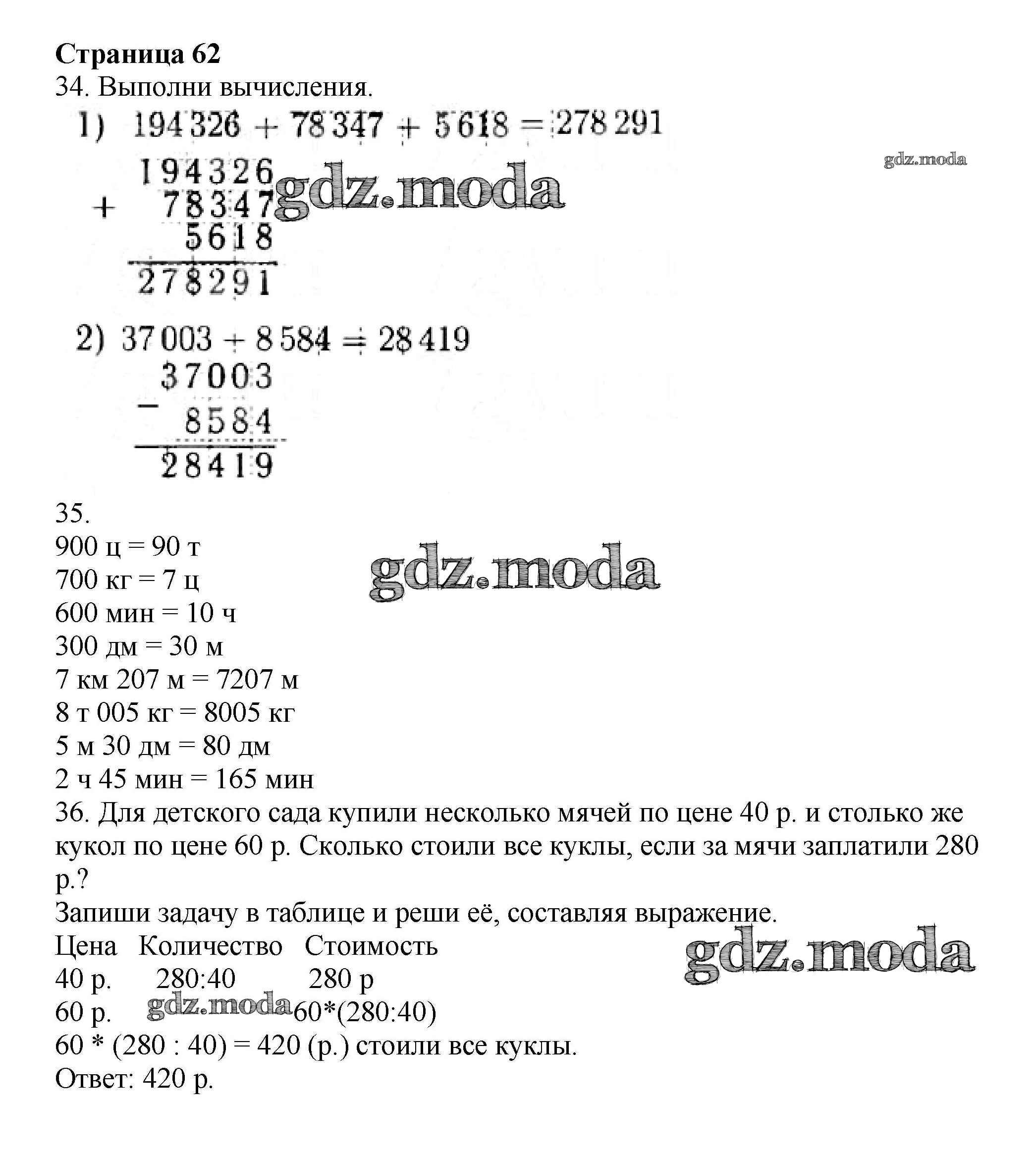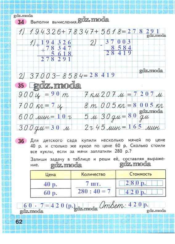ОТВЕТ на задание № 62 Рабочая тетрадь по Математике 4 класс Волкова Школа России