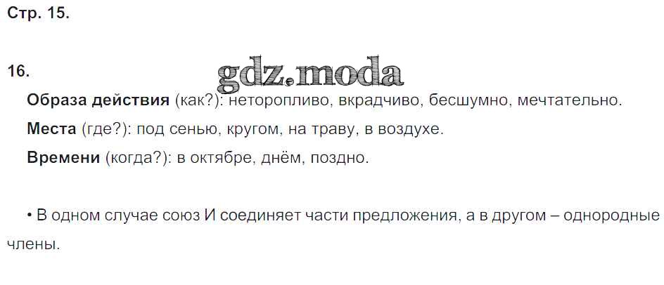 ГДЗ решение к заданию № 15 Русский язык 4 класс рабочая тетрадь Песняева Н.А. Просвещение 2017 Часть 1, Часть 2 ФГОС бесплатно на гдз.мода!