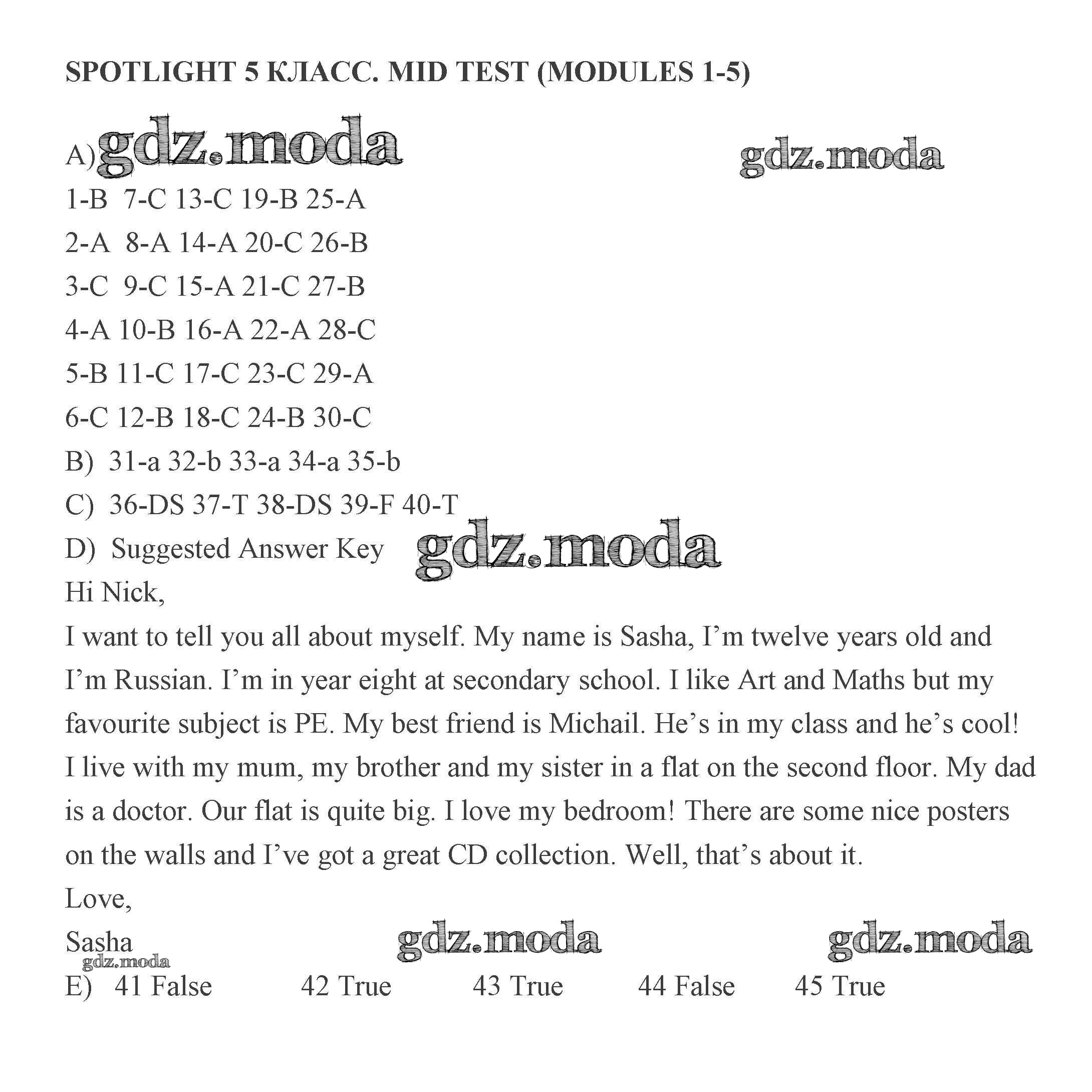ГДЗ решение к заданию № 1 Английский язык 5 класс контрольные задания Ваулина Spotlight Просвещение 2018 бесплатно на гдз.мода!