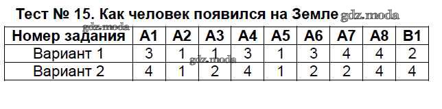 ГДЗ решение к заданию № Тест №15. Как человек появился на Земле Биология 5 класс Контрольно-измерительные материалы (КИМ) Богданов Н.А. ВАКО 2017 ФГОС бесплатно на гдз.мода!