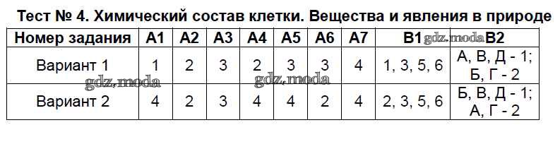 ГДЗ решение к заданию № Тест №4. Химический состав клетки. Вещества и явления в природе. Великие естествоиспытатели Биология 5 класс Контрольно-измерительные материалы (КИМ) Богданов Н.А. ВАКО 2017 ФГОС бесплатно на гдз.мода!