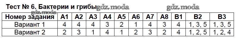 ГДЗ решение к заданию № Тест №6. Бактерии и грибы Биология 5 класс Контрольно-измерительные материалы (КИМ) Богданов Н.А. ВАКО 2017 ФГОС бесплатно на гдз.мода!