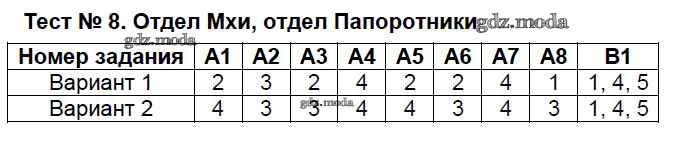 ГДЗ решение к заданию № Тест №8. Отдел Мхи, отдел Папоротники Биология 5 класс Контрольно-измерительные материалы (КИМ) Богданов Н.А. ВАКО 2017 ФГОС бесплатно на гдз.мода!