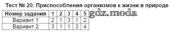ГДЗ решение к заданию № Тест №20. Приспособления организмов к жизни в природе Биология 5 класс Тесты Богданов Н.А. (к уч. Пономаревой) Экзамен 2017 ФГОС бесплатно на гдз.мода!
