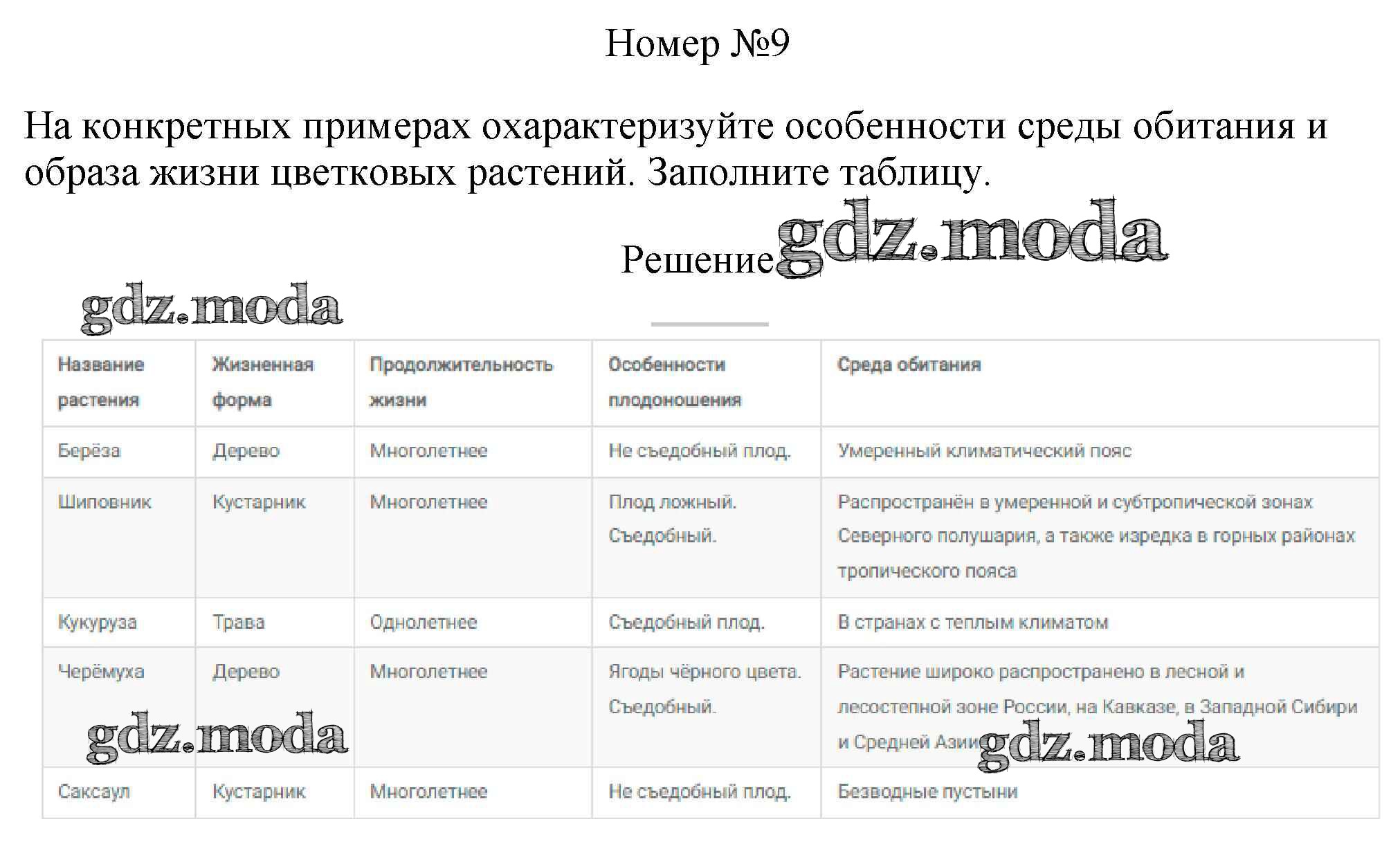 ГДЗ решение к заданию № 9 Биология 5 класс рабочая тетрадь Пасечник В.В. Просвещение, Просвещение 2015, 2020 ФГОС бесплатно на гдз.мода!
