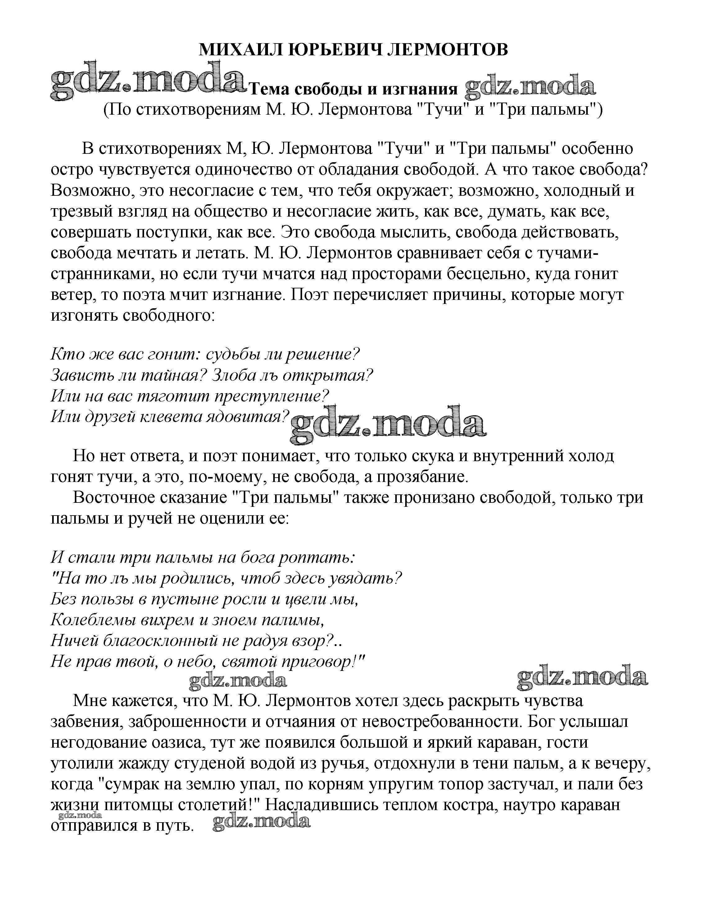 ГДЗ решение к заданию № Тема свободы и изгнания (По стихотворениям М. Ю. Лермонтова "Тучи" и "Три пальмы") Сочинения по русской литературе, зарубежной литературе 5-10 классы Белик Э. В. Баро-Пресс 2017 бесплатно на гдз.мода!