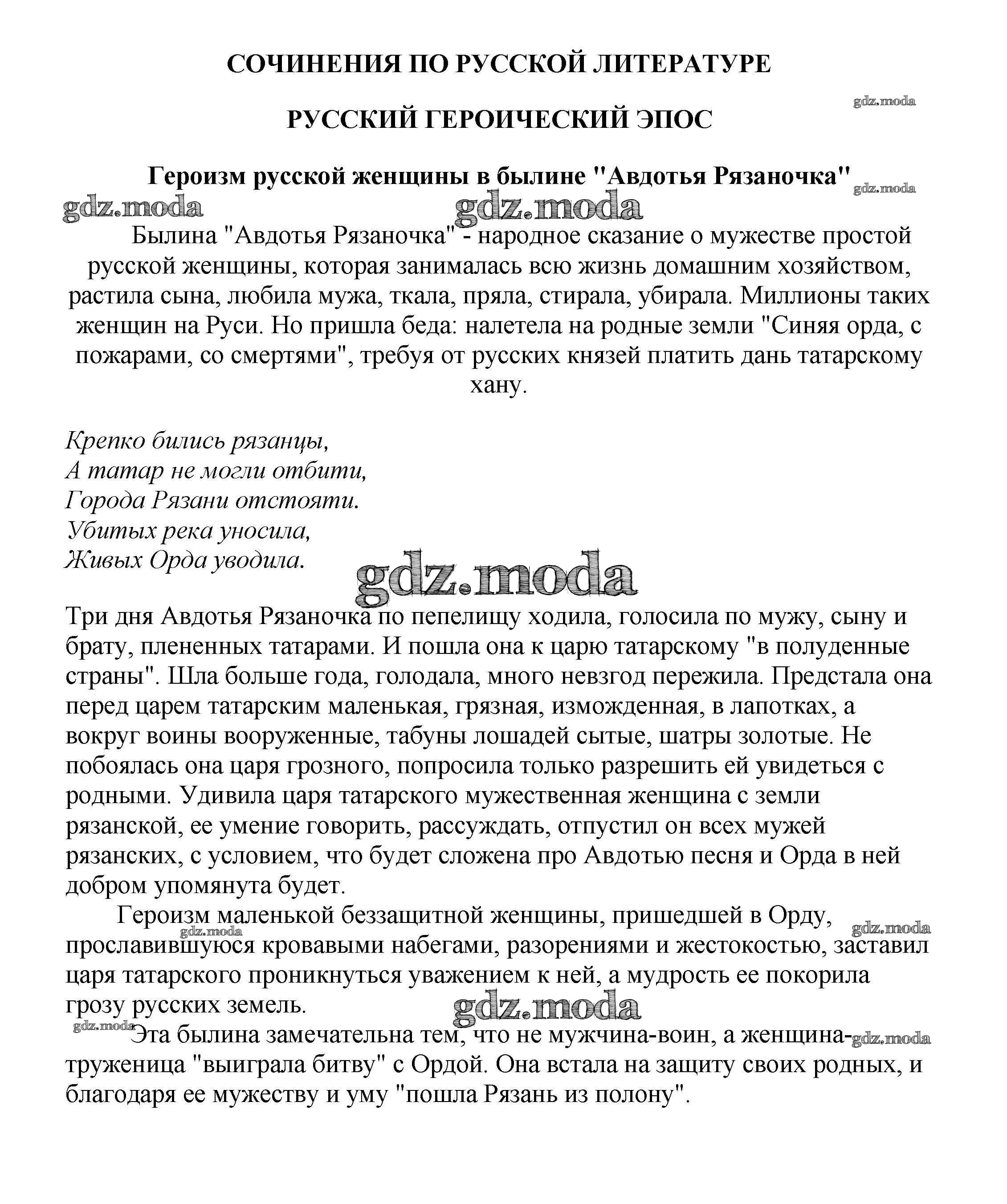 ГДЗ решение к заданию № Героизм русской женщины в былине "Авдотья Рязаночка" Сочинения по русской литературе, зарубежной литературе 5-10 классы Белик Э. В. Баро-Пресс 2017 бесплатно на гдз.мода!