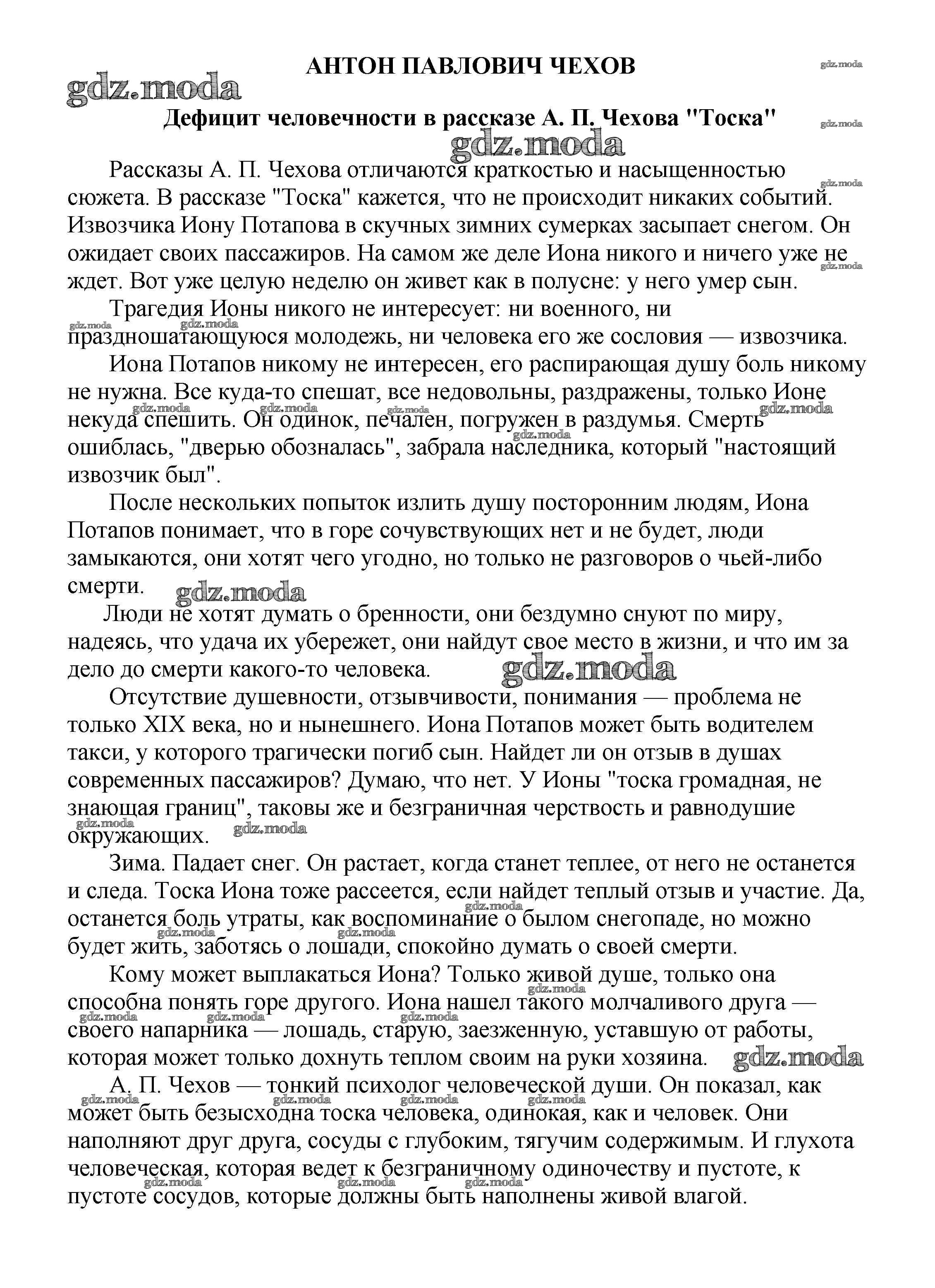 ГДЗ решение к заданию № Дефицит человечности в рассказе А. П. Чехова "Тоска" Сочинения по русской литературе, зарубежной литературе 5-10 классы Белик Э. В. Баро-Пресс 2017 бесплатно на гдз.мода!