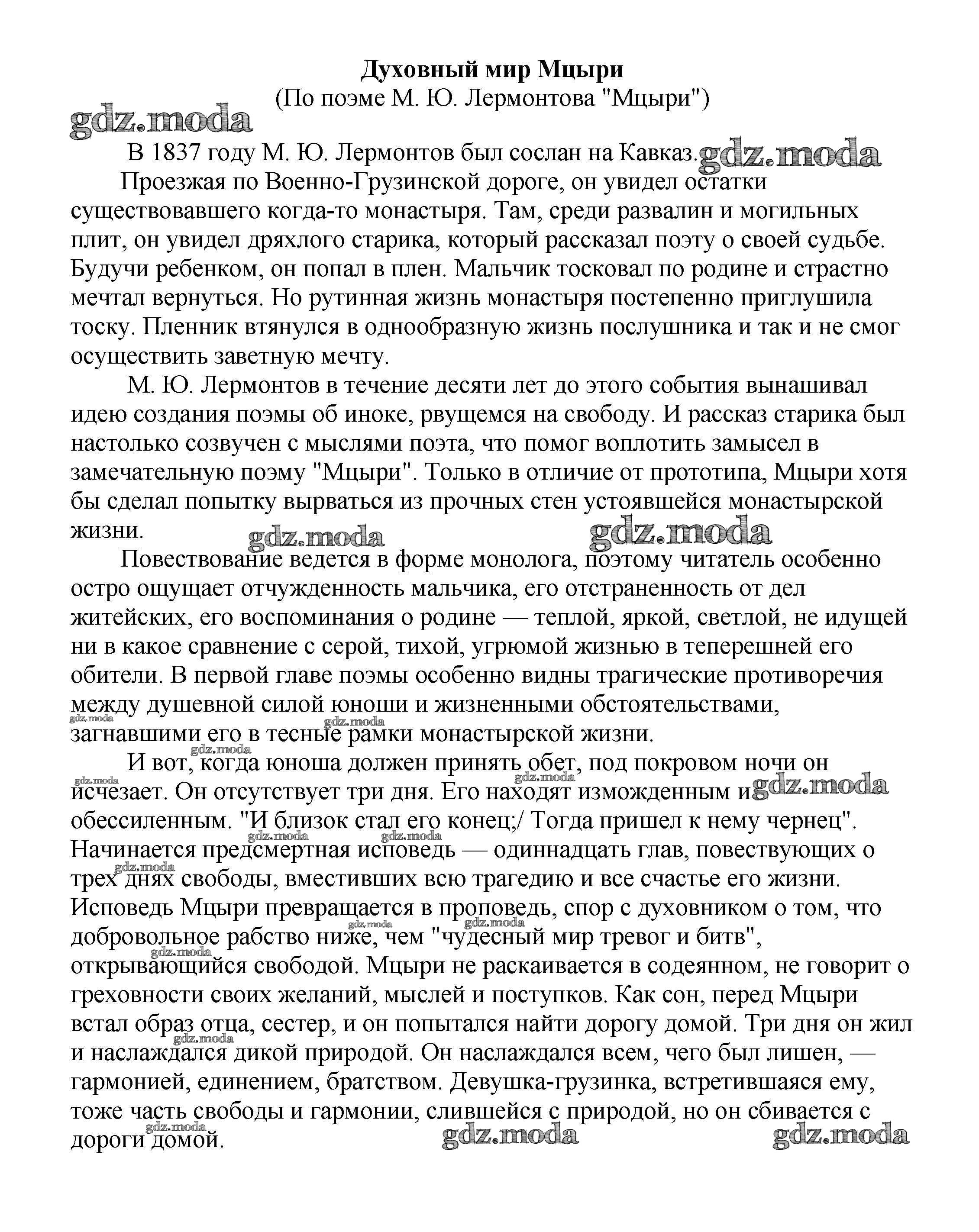 ОТВЕТ на задание № Духовный мир Мцыри (По поэме М. Ю. Лермонтова "Мцыри") Сочинения по Литературе 5-10 класс Белик