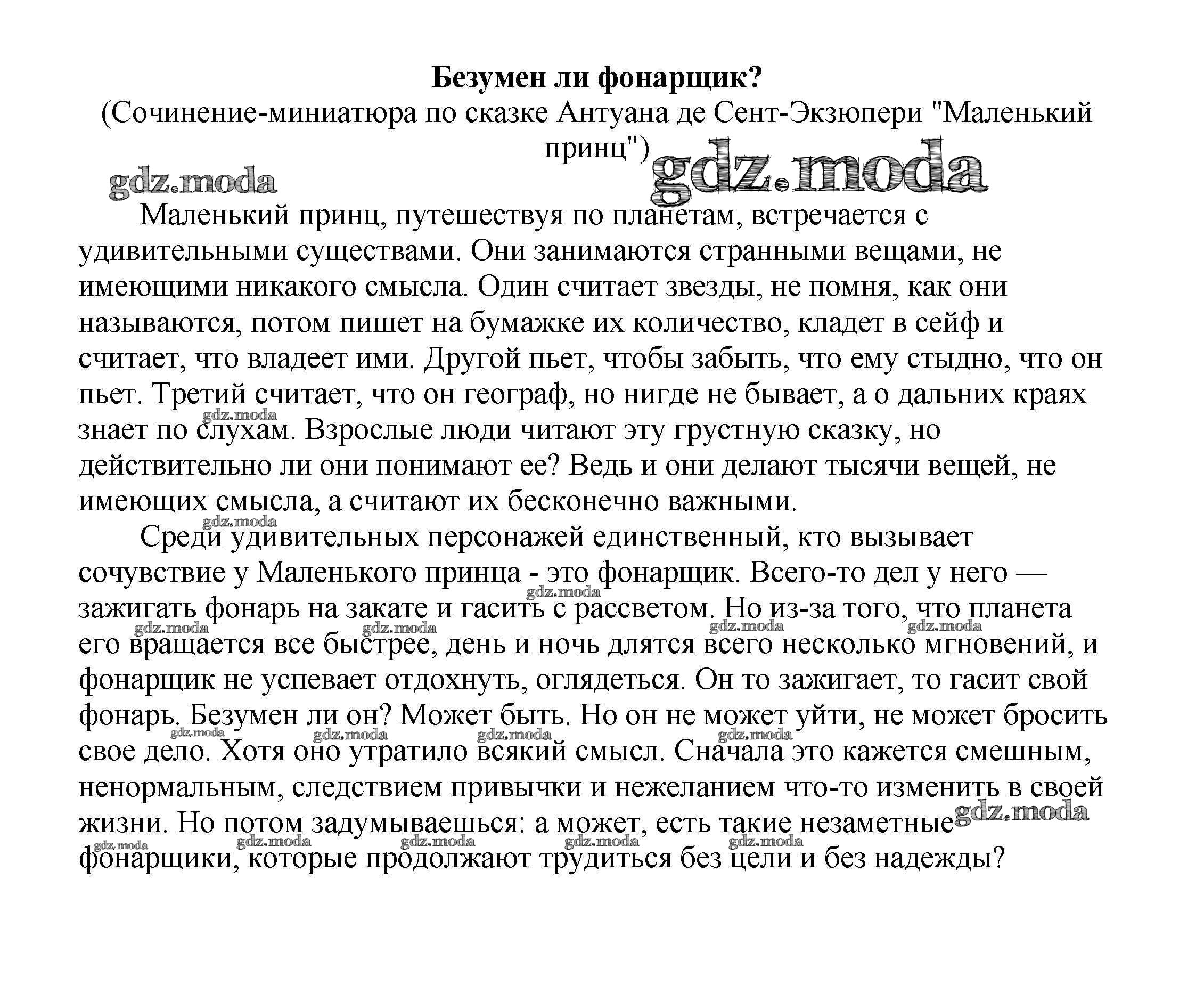 ГДЗ решение к заданию № Безумен ли фонарщик? (Сочинение-миниатюра по сказке Антуана де Сент-Экзюпери "Маленький принц") Сочинения по русской литературе, зарубежной литературе 5-10 классы Белик Э. В. Баро-Пресс 2017 бесплатно на гдз.мода!