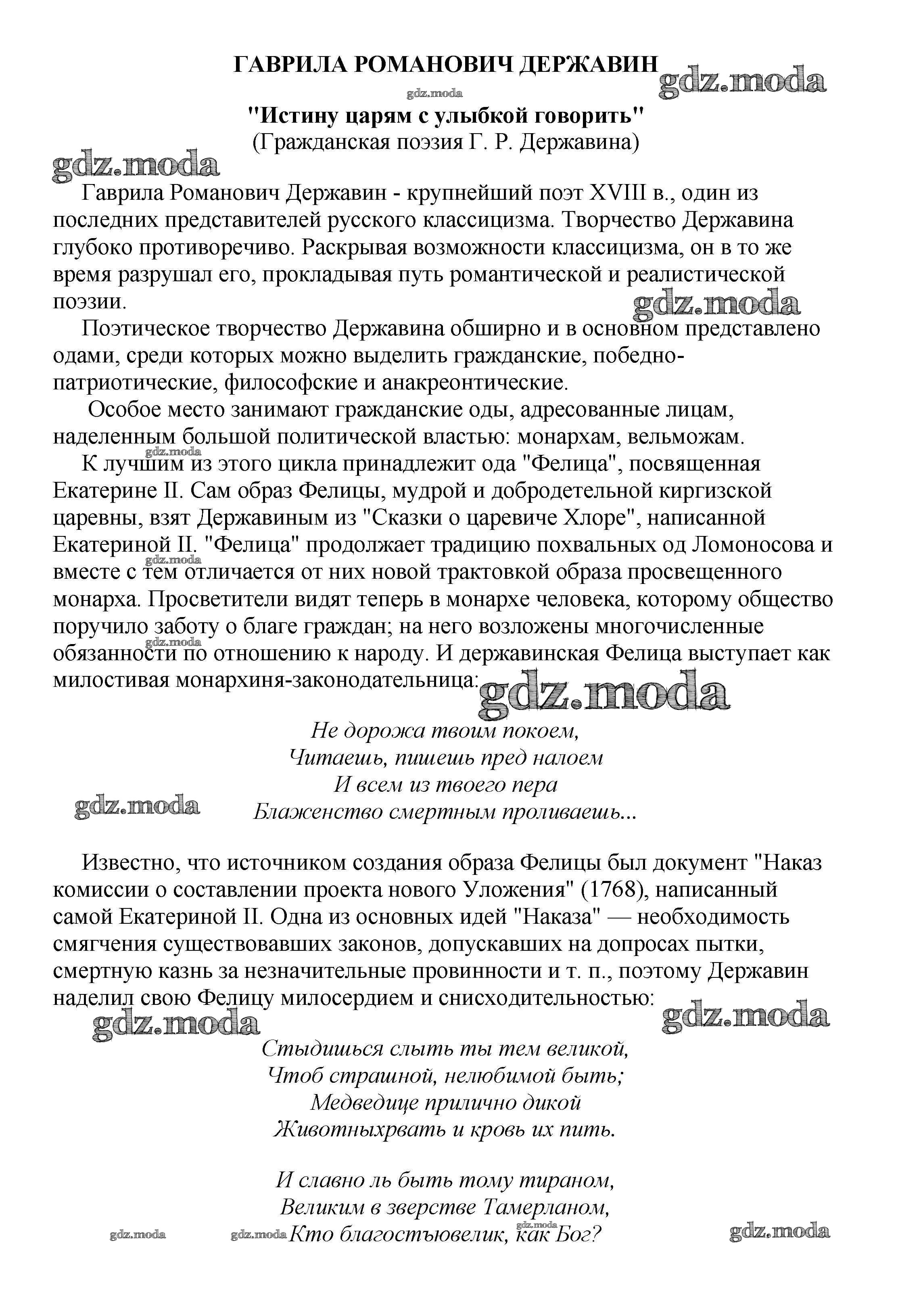 ОТВЕТ на задание № "Истину царям с улыбкой говорить" (Гражданская поэзия Г. Р. Державина) Сочинения по Литературе 5-10 класс Белик