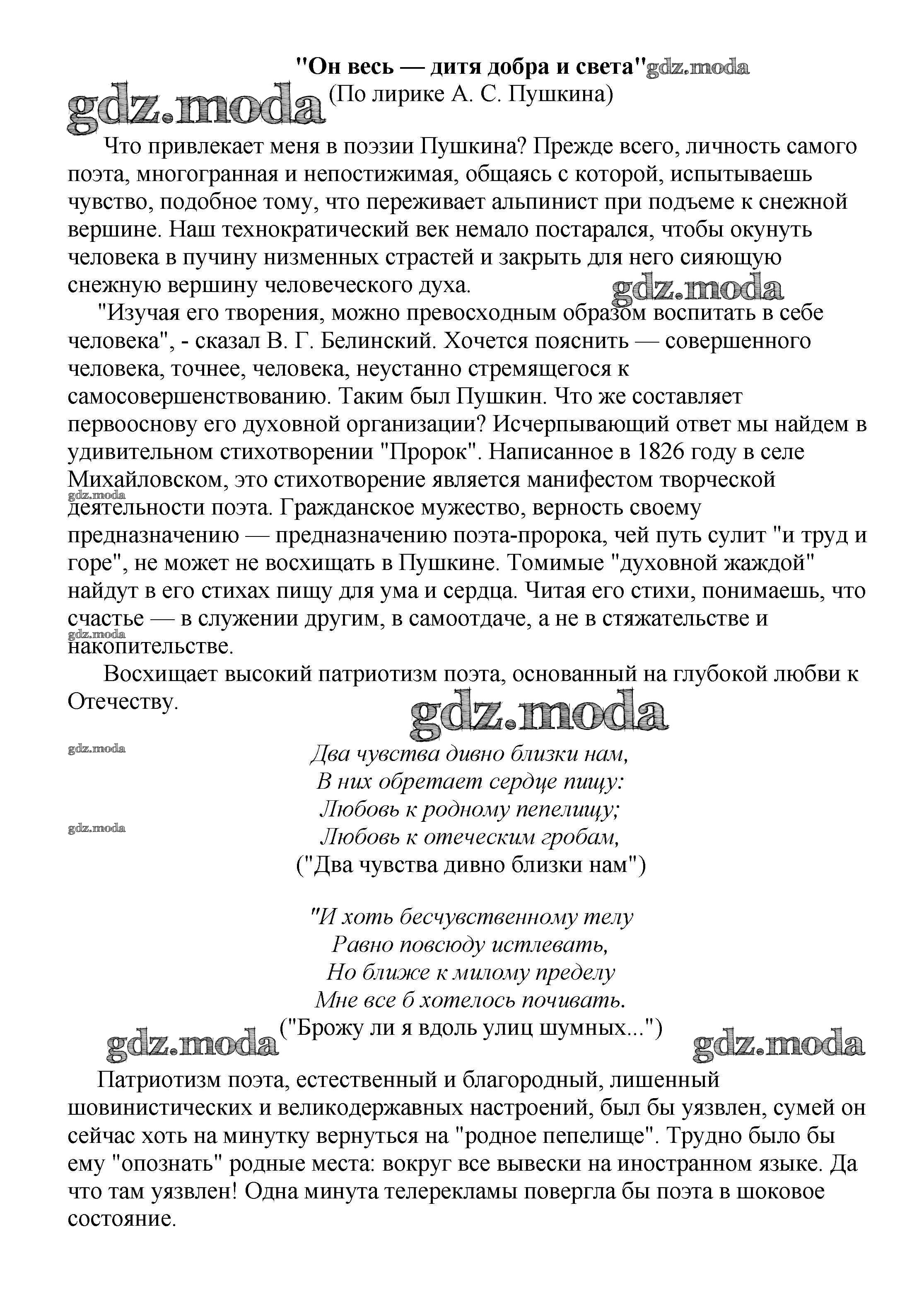 ГДЗ решение к заданию № "Он весь — дитя добра и света" (По лирике А. С. Пушкина) Сочинения по русской литературе, зарубежной литературе 5-10 классы Белик Э. В. Баро-Пресс 2017 бесплатно на гдз.мода!