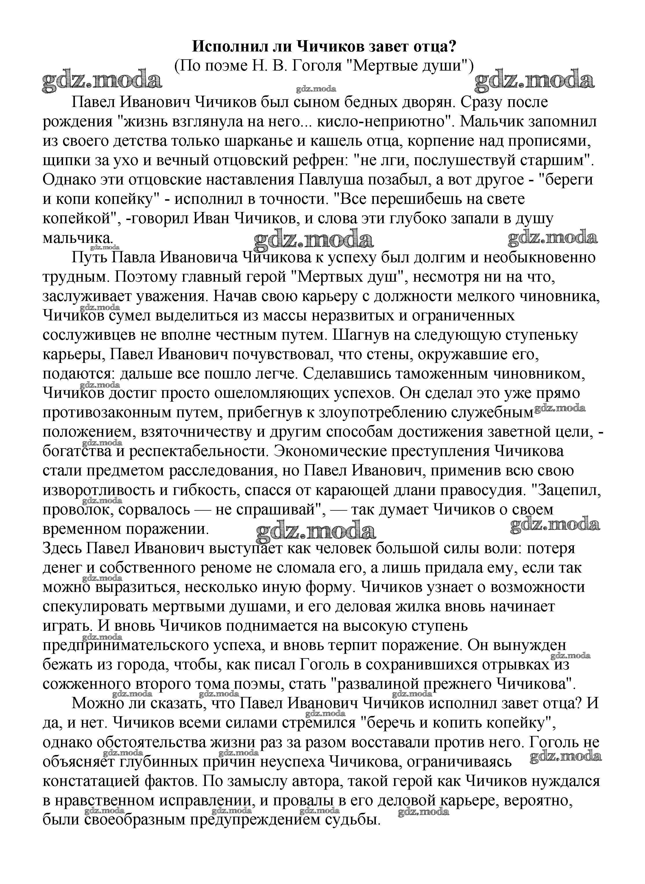 ОТВЕТ на задание № Исполнил ли Чичиков завет отца? (По поэме Н. В. Гоголя "Мертвые души") Сочинения по Литературе 5-10 класс Белик